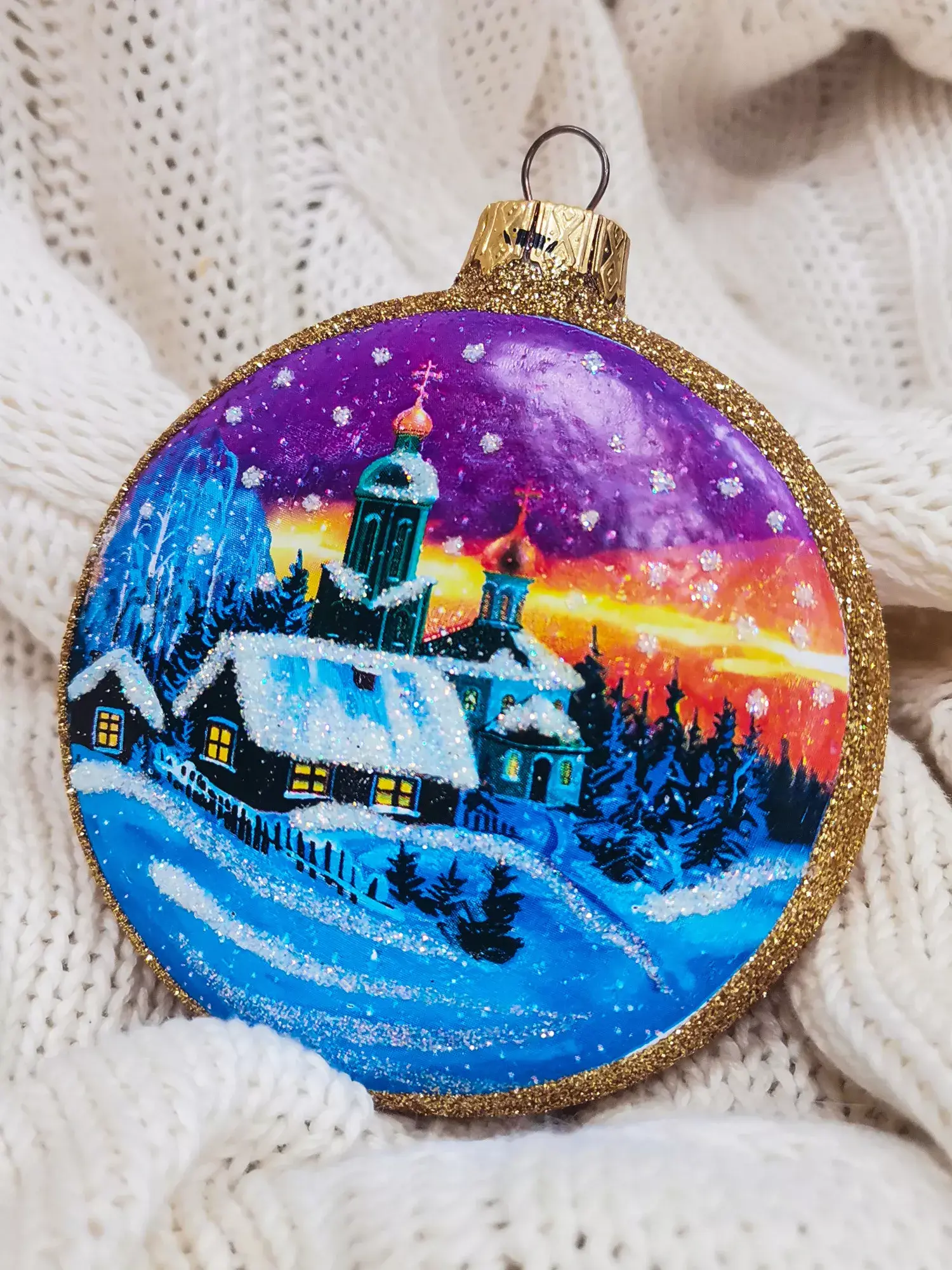 На фоне зимнего леса и нереально красивого заката сельский домик, припорошенный снегом, смотрится восхитительно. Этот зимний пейзаж выполнен в сочных красках и украшен переливающейся золотой окантовкой, что превращает его в самое настоящее произведение искусства. Медальон «Пейзаж» отлично смотрится на елке любого цвета и фактуры, а значит, вариант беспроигрышный для новогоднего декора.