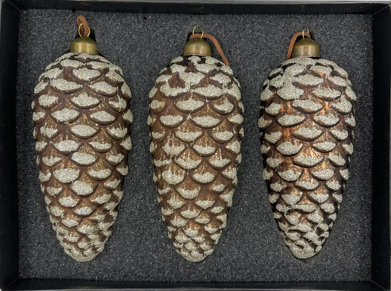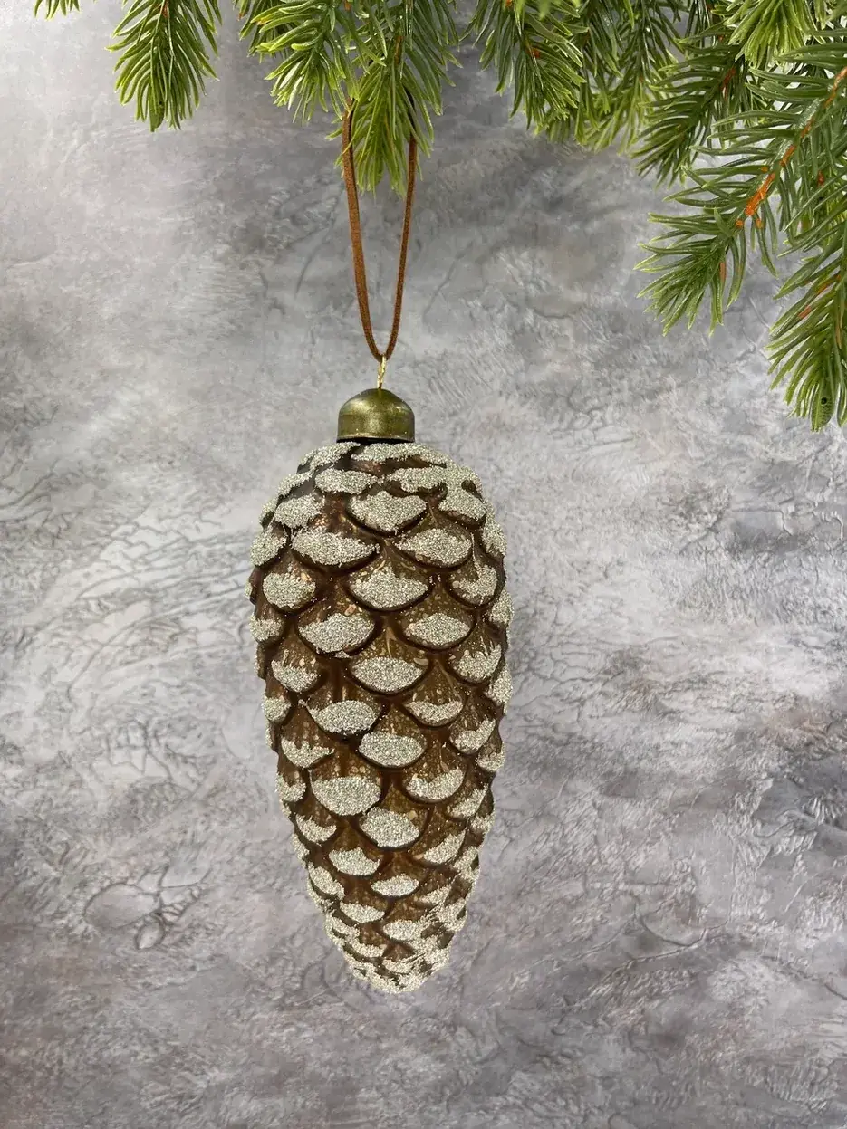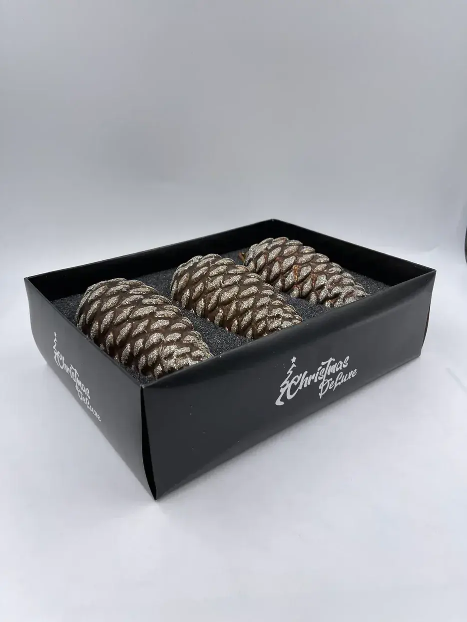 Большие стеклянные шишки кажутся только сорванными с гигантской ели или пихты. Они очень органично смотрятся на высоком, пышном дереве. Чем больше комплектов, тем натуралистичнее и красивее выглядит елка. Добавьте к шишкам прозрачные стеклянные сосульки, белые шары и серебристую мишуру, и ваша елка будет выглядеть так, словно ее привезли из заснеженной сибирской тайги.
