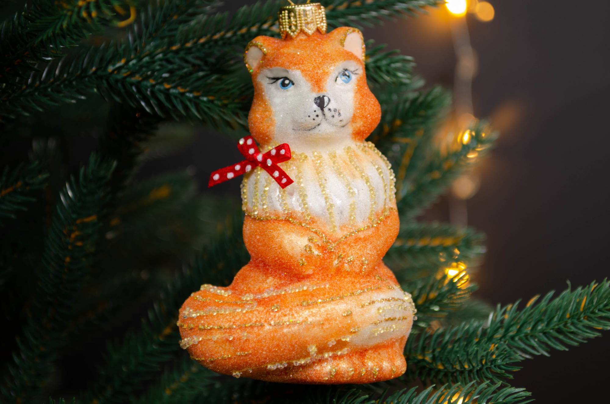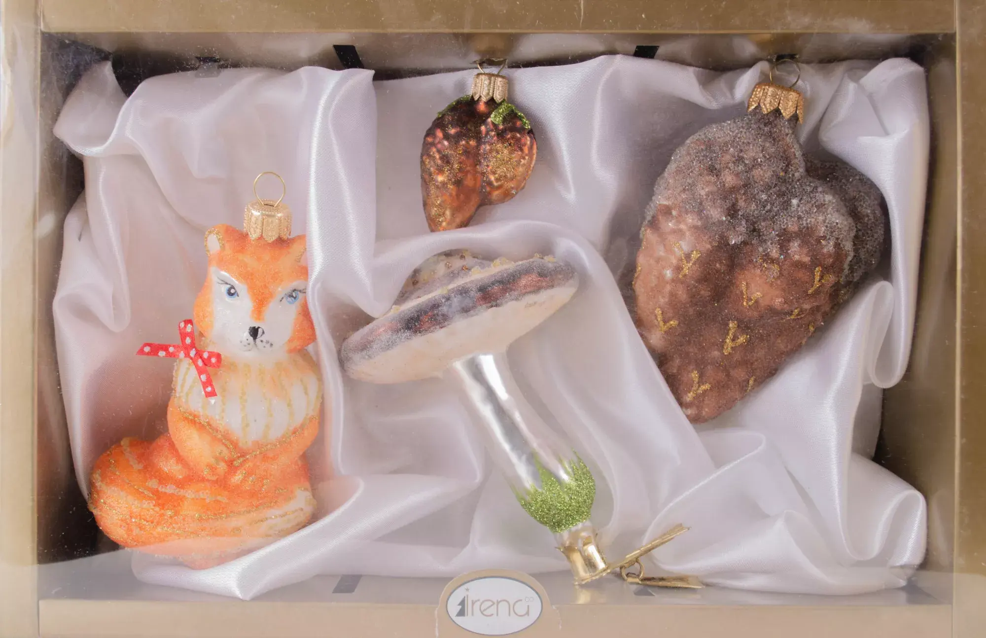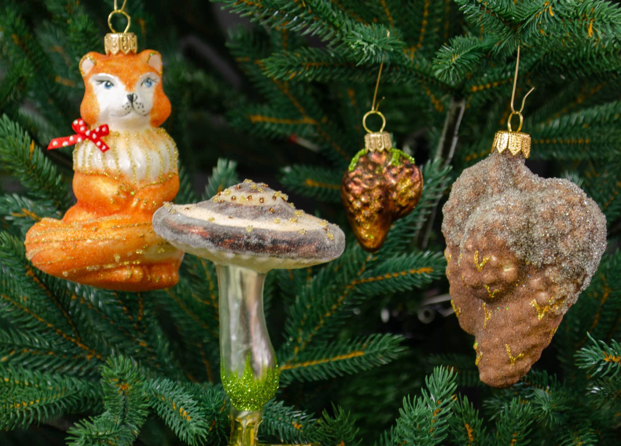 Крупные реалистичные и глянцевые декоративные шишки, сверкающий грибок и лиса-краса гармонично смотрятся на натуральной ели или искусственном дереве темно-зеленого цвета. Лисичка с кокетливым красным бантиком в горох и дары леса составили незатейливую, но очень милую композицию от известного бренда Irena. Такой набор придется по душе любителям эко-стиля.