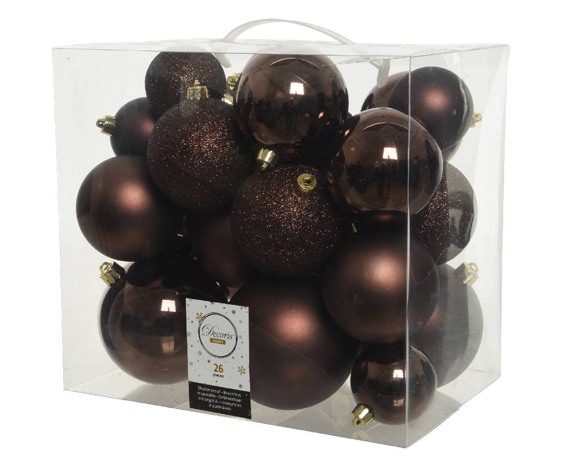 Классический новогодний набор из 26 шаров Kaemingk можно встретить в каждом доме. Шары разного размера, но в одном цвете – самое популярное украшение от Москвы до Владивостока. Когда не хочется ничего придумывать, но при этом мечтаете создать праздничную и нарядную атмосферу, то такие шары – лучшее решение! Они могут быть в каком угодно цвете, хоть белом, хоть лиловом или бронзовом – главное, что игрушки так красиво переливаются на елке, оттеняя ее новогоднюю красу. В набор входят шары различного диаметра, гладкие полированные, матовые и покрытые насыщенными блестками. Вешая их по своему вкусу на елку, вы творите праздник в доме! Подключите к процессу всех детей от мала до велика – пусть каждый выберет шары и развешивает их в соответствии со своими представлениями о прекрасном.