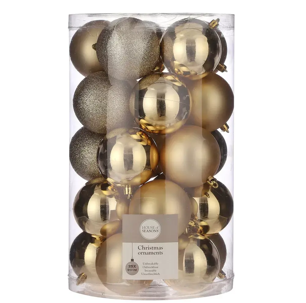 Россыпь блестящих и матовых шаров богатого золотого цвета на белоснежной елке – зрелище невероятно привлекательное. А как вам такие же красавцы в изумрудном, нежно-розовом, багряно-красном, серебристом или бронзовом цвете, но на новогоднем деревце традиционного зеленого цвета? Смотрятся они не менее эффектно! Для того чтобы претворить в жизнь любую из вышеперечисленных идей, приобретите набор пластиковых елочных шаров «Рокси», вы не пожалеете! Глядя на эту красоту, невзгоды уходящего года моментально забудутся и захочется верить, что следующий год будет полон приятных событий. Шарики «Рокси» украсят елку любой величины, ведь в наборе 25 шаров!