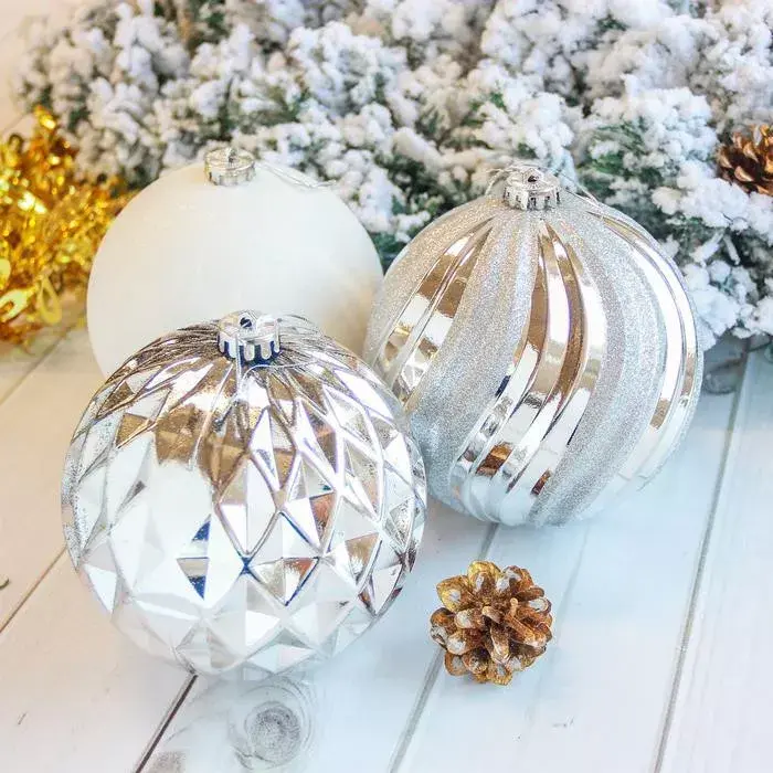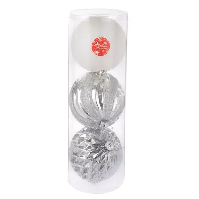 Набор пластиковых елочных шаров «Гиганты» – отличное решение для тех, кто не приемлет однообразия. Набор состоит из трех крупных шаров. Белоснежный шар поражает своим совершенством, а ребристые шары с разными принтами в серебристо-белой цветовой гамме вызывают восхищение у любителей холодных оттенков.