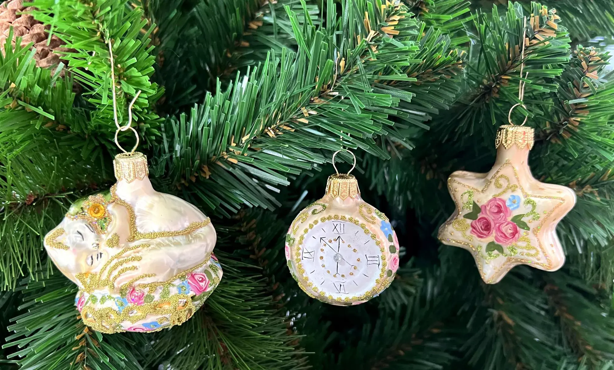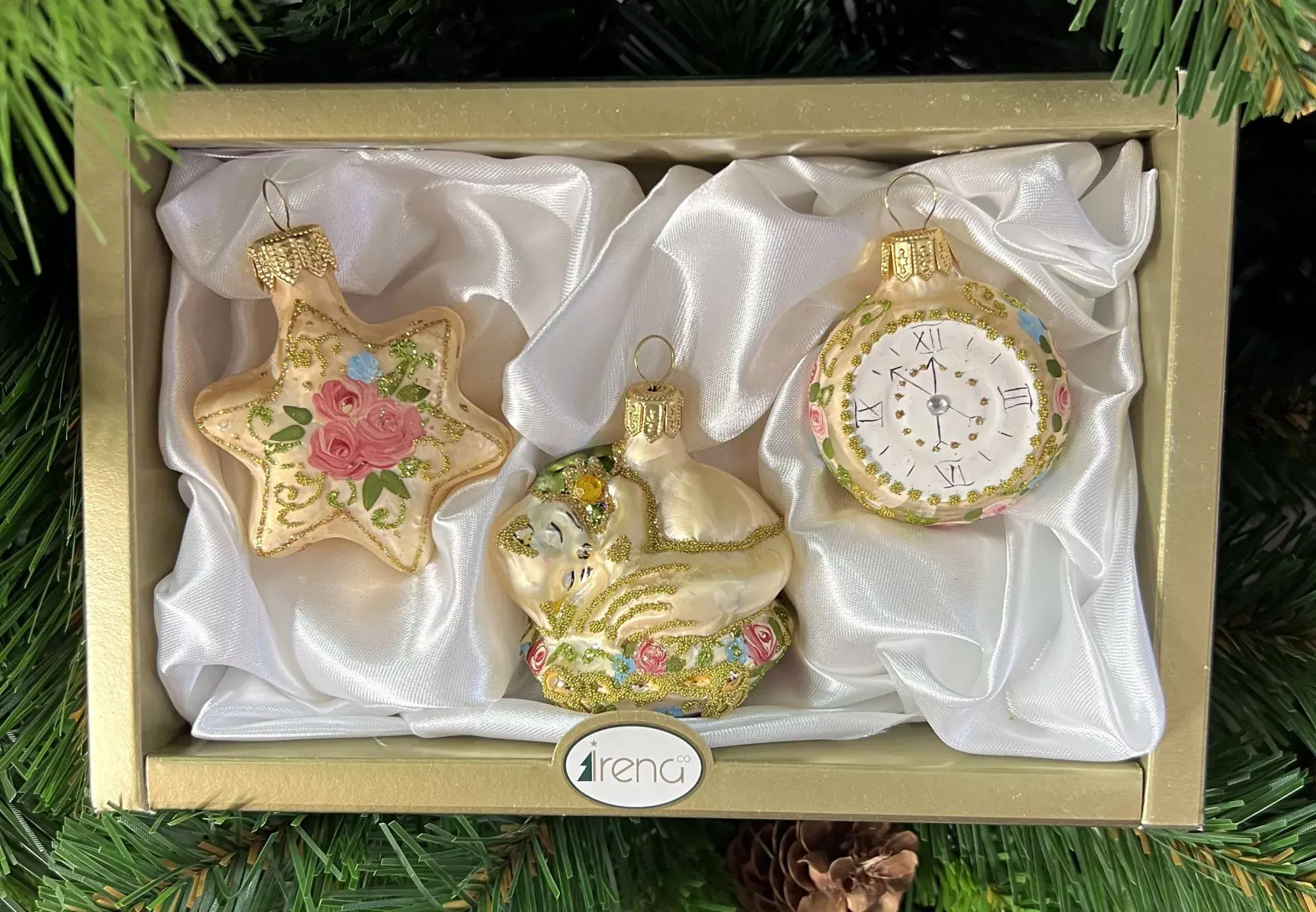 Набор Версаль «Звезда, часы и кот на подушке от фирмы» Irena – настоящее произведение искусства талантливого художника. Каждый изгиб, каждая линия выполнены с любовью. Игрушки смотрятся нарядно и делают помещение уютнее. Котик спит под мерное тиканье часов, в нереально красивая звезда светит в окно, навевая мысли о хорошем. Пусть с таким елочным украшением в вашем доме всегда царит атмосфера любви и добра!