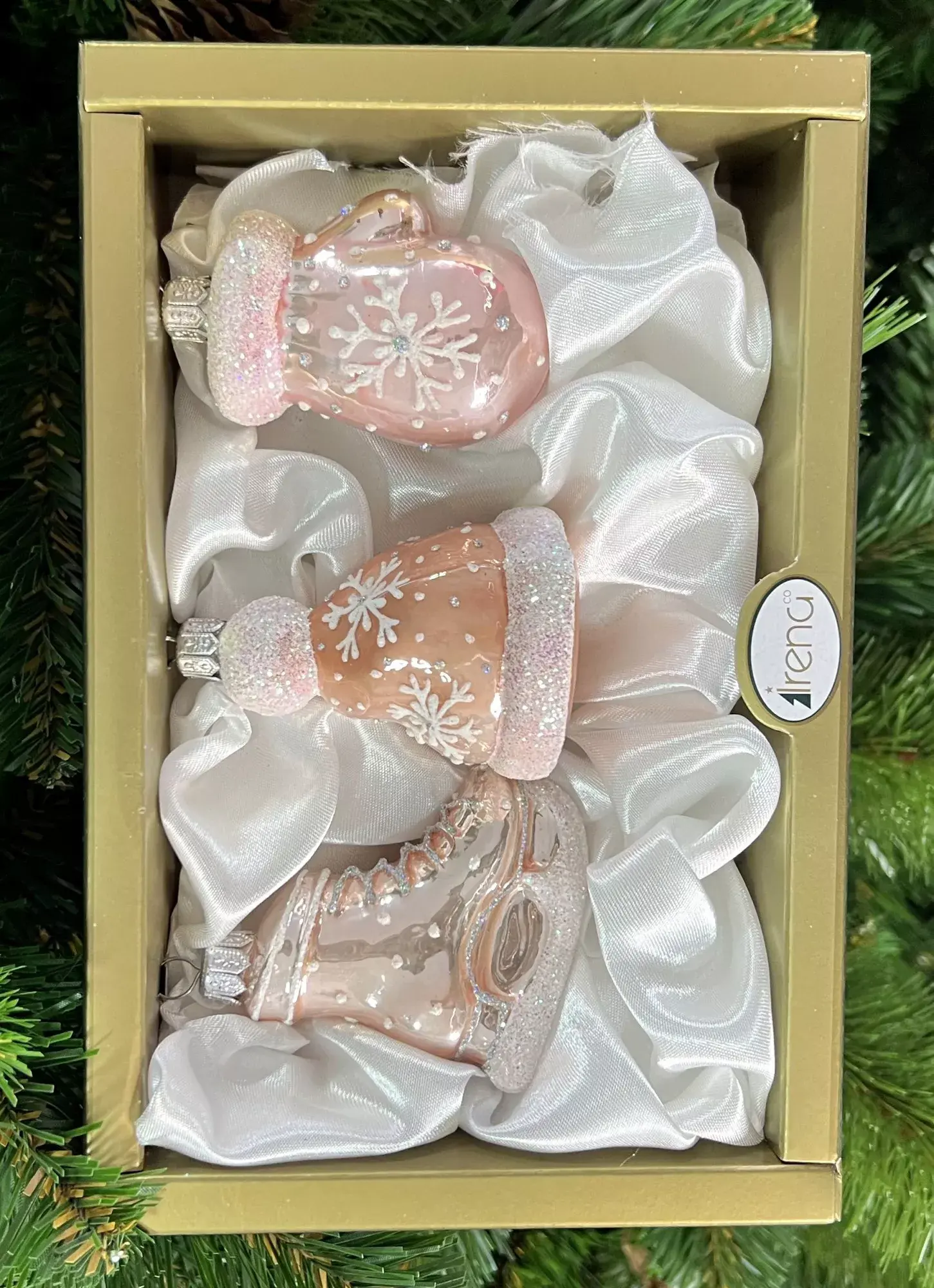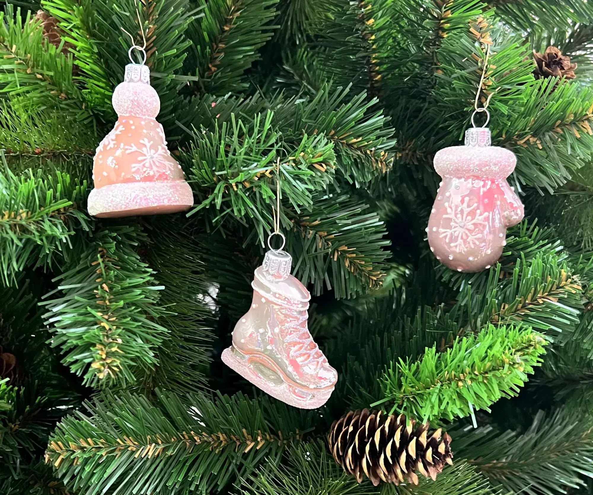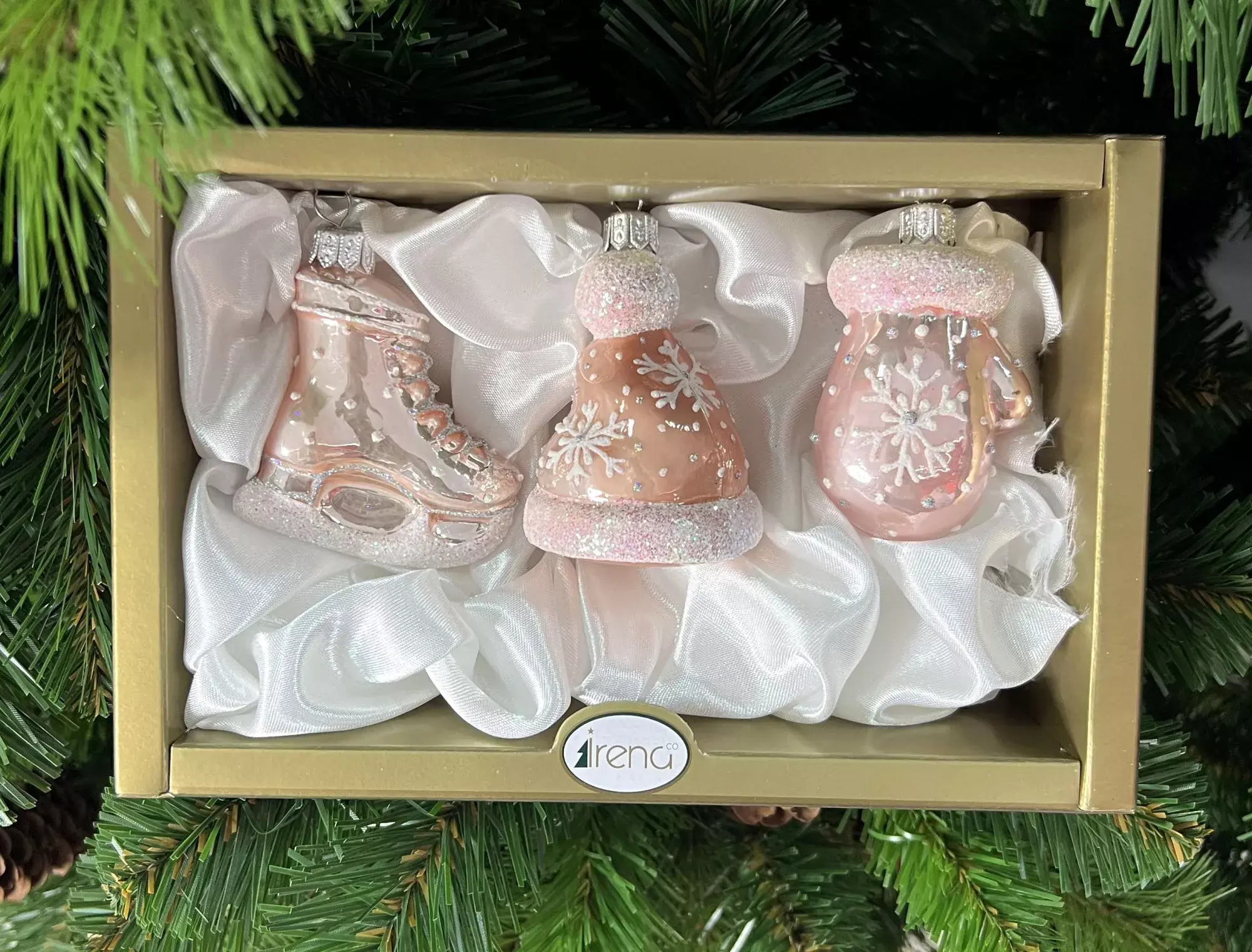 Одна из самых интересных задумок дизайнеров фирмы Irena – набор «Зимний». В набор входит варежка, шапочка и конек цвета шампанского, причем все составные части набора покрыты эмалью и украшены снежинками. Новогодние аксессуары выглядят очень оригинально и с первого взгляда покорят любителей нестандартного дизайна. Особенно эффектно смотрятся на фоне хвои белого или красного цвета.