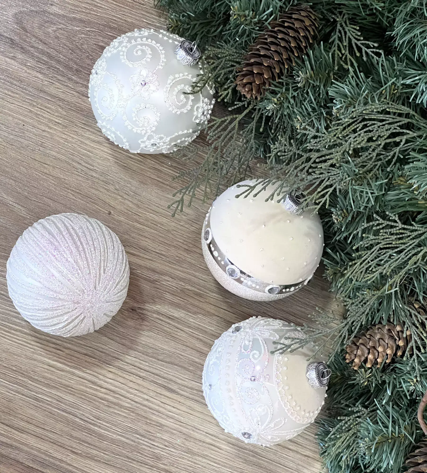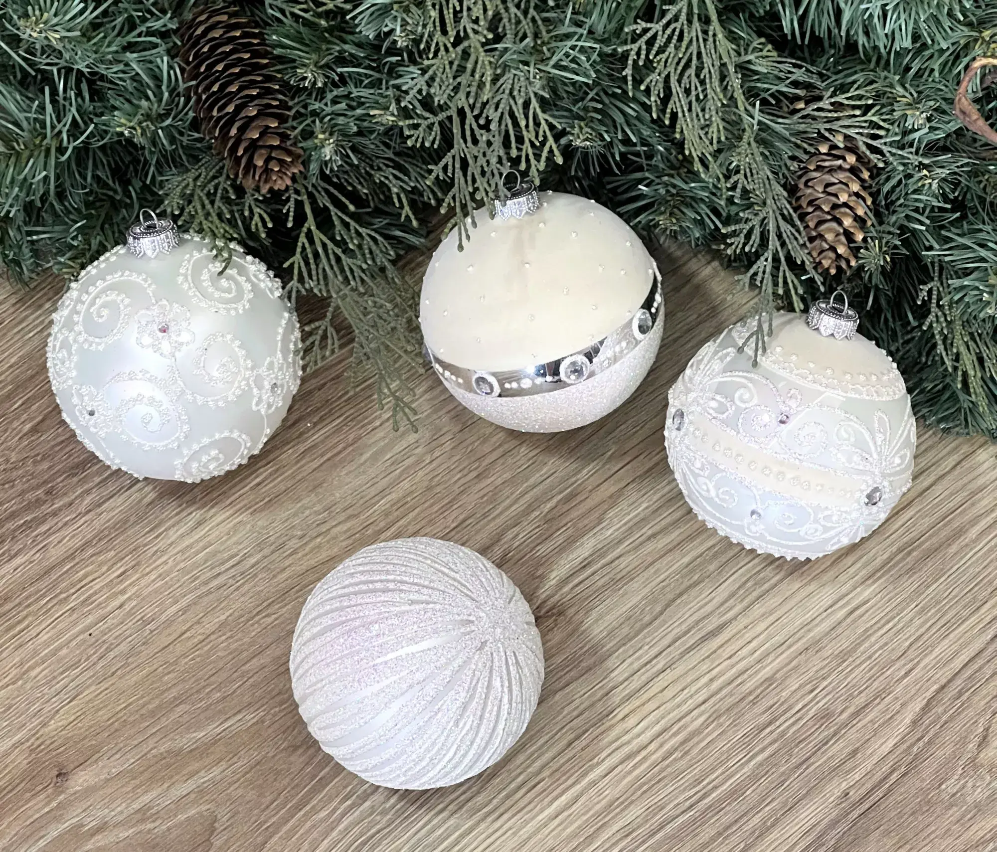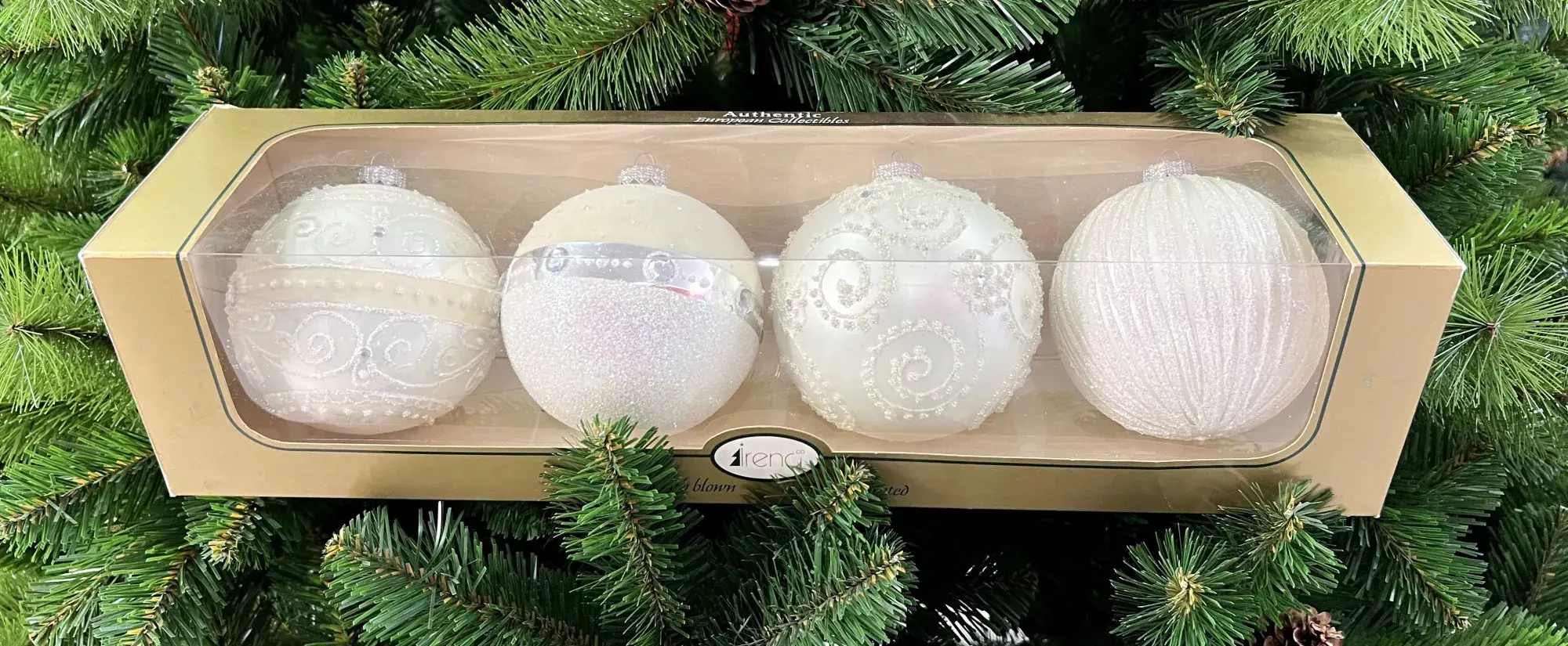 Белый цвет – вне времени! А значит, «Белая коллекция» от фирмы Irena по праву займет почетное место среди ваших новогодних игрушек. Совершенная белизна, изящные узоры и загадочное мерцание страз выглядят празднично. Шары из «Белой коллекции» невероятно привлекательно смотрятся как на зеленой так и на заснеженной ели.