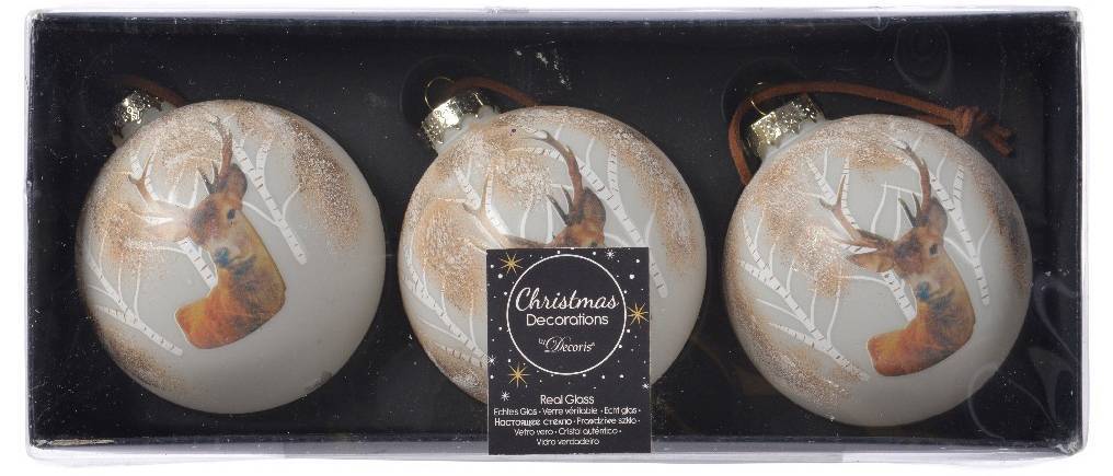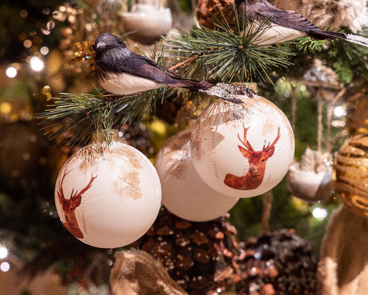Олень – один из самых новогодних зверей. Именно упряжка оленей несет Санта Клауса, спешащего с подарками к детям, и на северном олене спаслась Герда в сказке Андерсона «Снежная королева». Словом, украсить елочку несколькими игрушками с оленями представляется весьма хорошим делом. Благо, Kaemingk как раз создал специальную «оленью» серию из 3х шаров в двух цветах. И серия эта наша, русская, ведь олень, изображенный на шаре, гуляет в любимых нами березках. Белые и золотисто-зеленые шары прекрасно смотрятся на натуральной хвое, еще больше подчеркивая ее естественную красоту. Но не менее интересно выглядят украшения на искусственном дереве, особенно если выбрать в магазине модель в цвет шара – белую или с золотым декором.