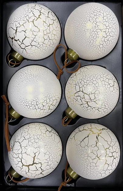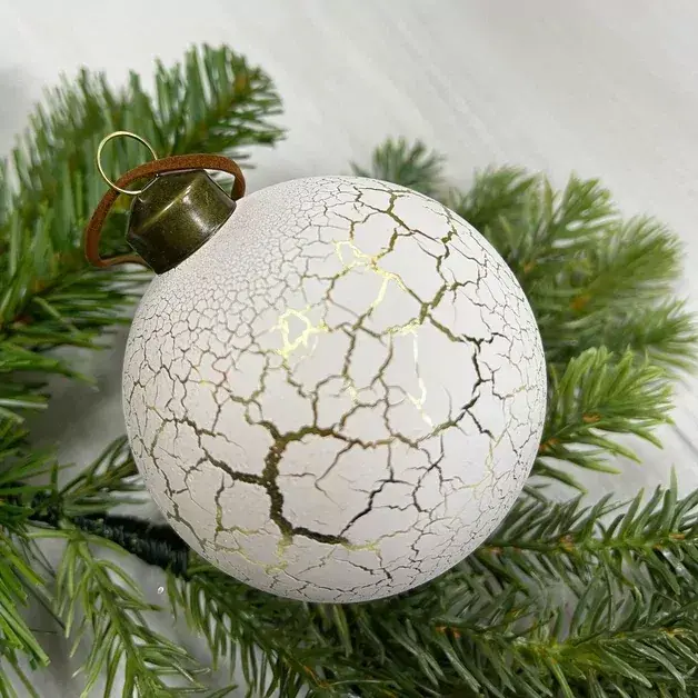 Эффект кракелюр смотрится очень выигрышно и уверенно держится среди трендов в дизайне помещений, ногтевом сервисе и, конечно же, в оформлении елочных украшений. В оформлении «Рождественских» стеклянных шаров, помимо эффекта кракелюра, имеется еще одна фишка – игра на контрасте хрупкого и прозрачного с насыщенным белоснежным. Результат впечатляет!