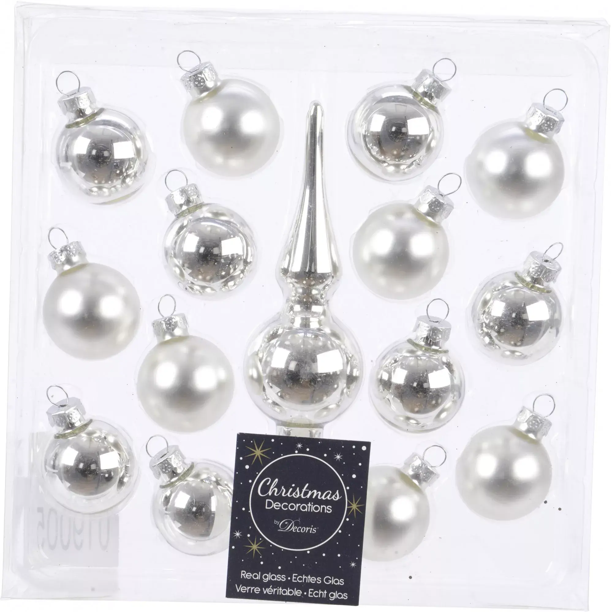 При всем богатстве выбора новогодних украшений из пластика, любителей стекла не становится меньше. Прекрасное решение для настольной ели - 14 шаров диаметром 3см и грациозная макушка позволят полностью украсить елочку от 30 до 90 см.