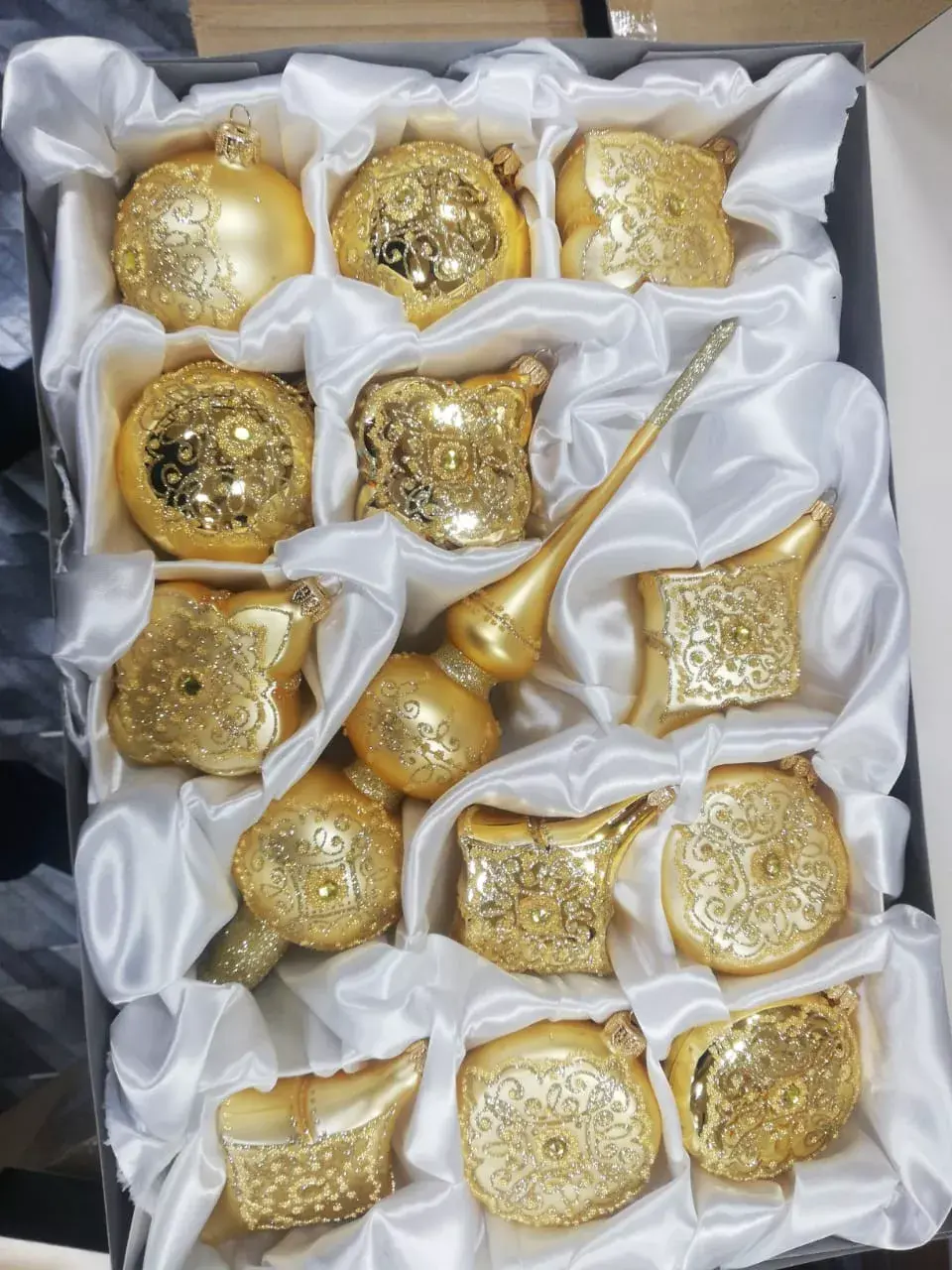 Шары удивительно нежного бирюзового цвета с изящным золотым узором и верхушка той же цветовой гаммы – идеальное решение для елки традиционного зеленого цвета. Но если вы хотите чего-нибудь свеженького, приобретите елку белого цвета и украсьте набором «Кармелита» от фирмы Irena. Гости оценят ваш изысканный вкус и не смогут глаз оторвать от такой ослепительной красоты!