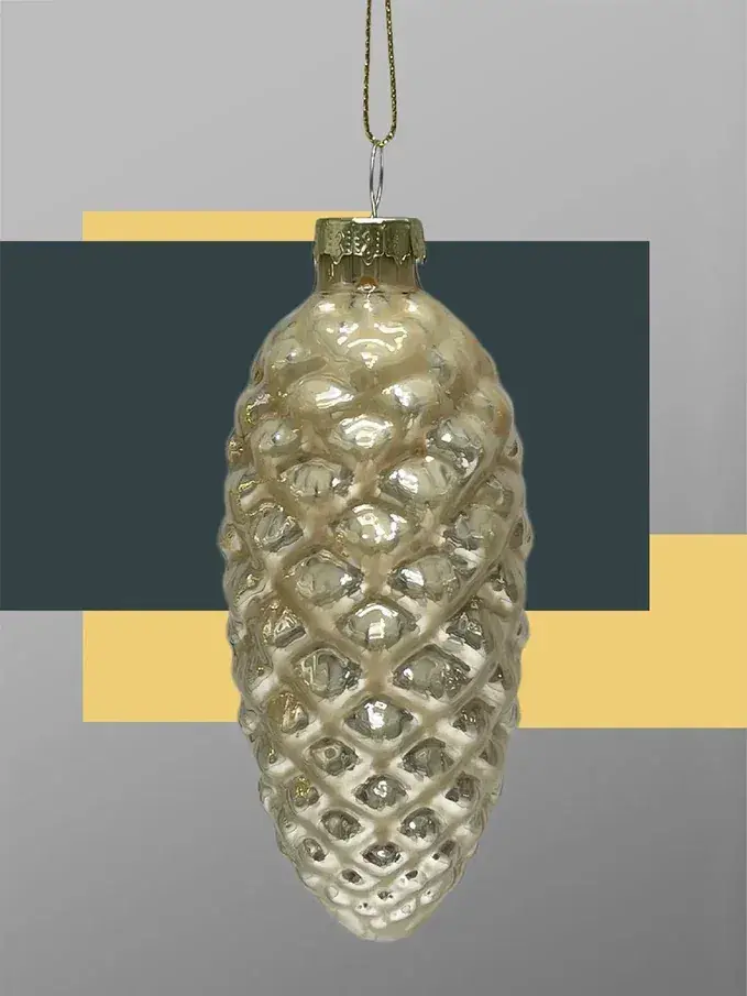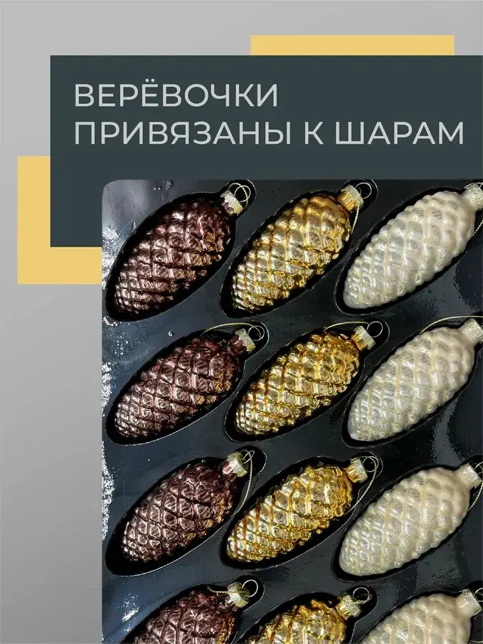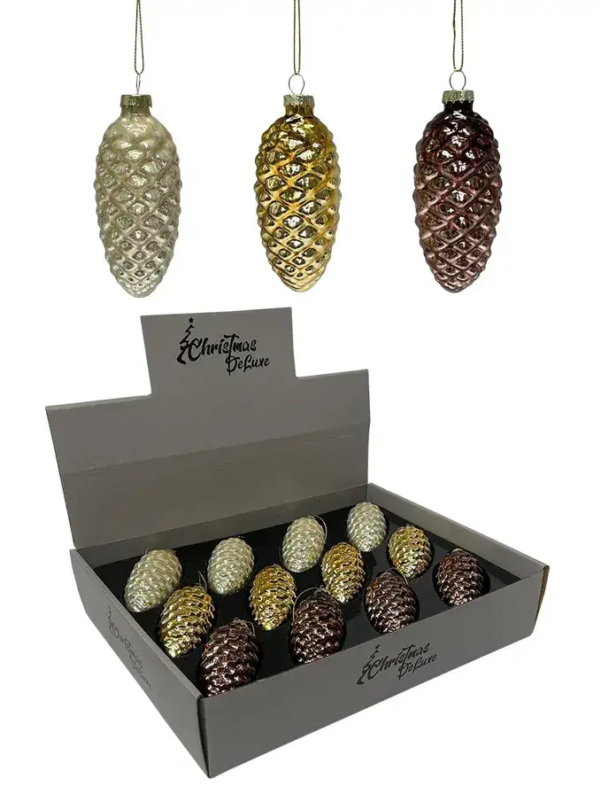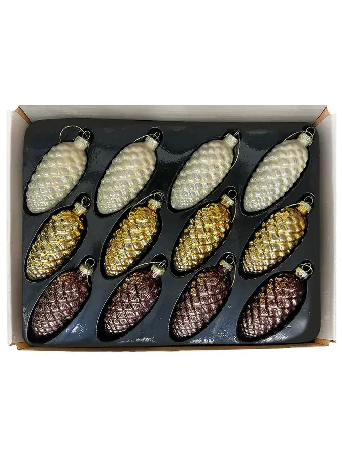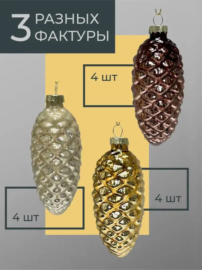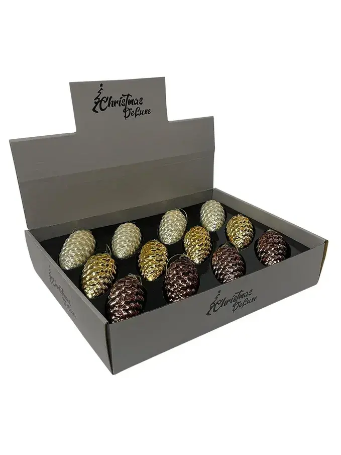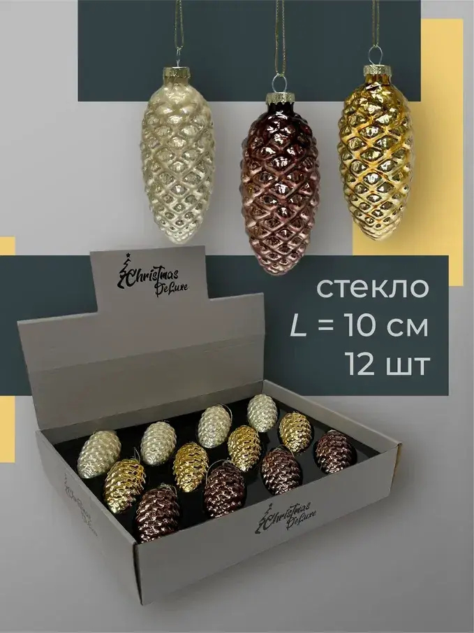 Набор стеклянных елочных игрушек в форме шишек Бронзовый век от бренда Christmas DeLuxe включает 12 штук. Игрушки выполнены в трех цветах: золотистом, бронзовом и белом, что позволяет создать гармоничное украшение для елки. Размер каждой шишки составляет 10×5 см, что делает их удобными для размещения на ветвях.