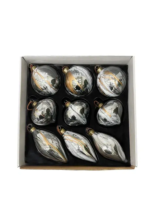 Если вы больше всего любите шары в декоре елки, но вам хочется немного разнообразить привычное оформление, то используйте необычные шары. Такие, как в наборе «Акварель». Их глубокий, насыщенный серый цвет подчеркивает яркость освещения, игру гирлянд и светодиодов, отлично отражает свет ламп и люстр. Серые шары покрыты сложными узорами и добавят любой елке красоты и стиля.