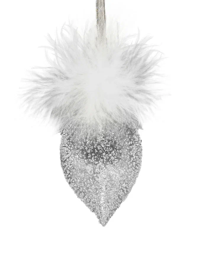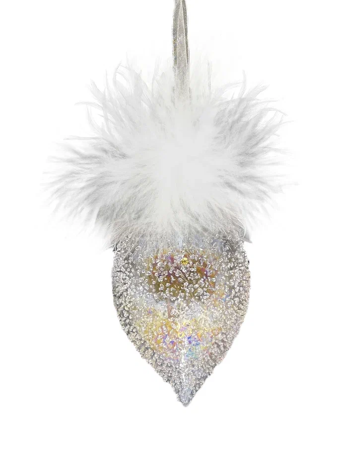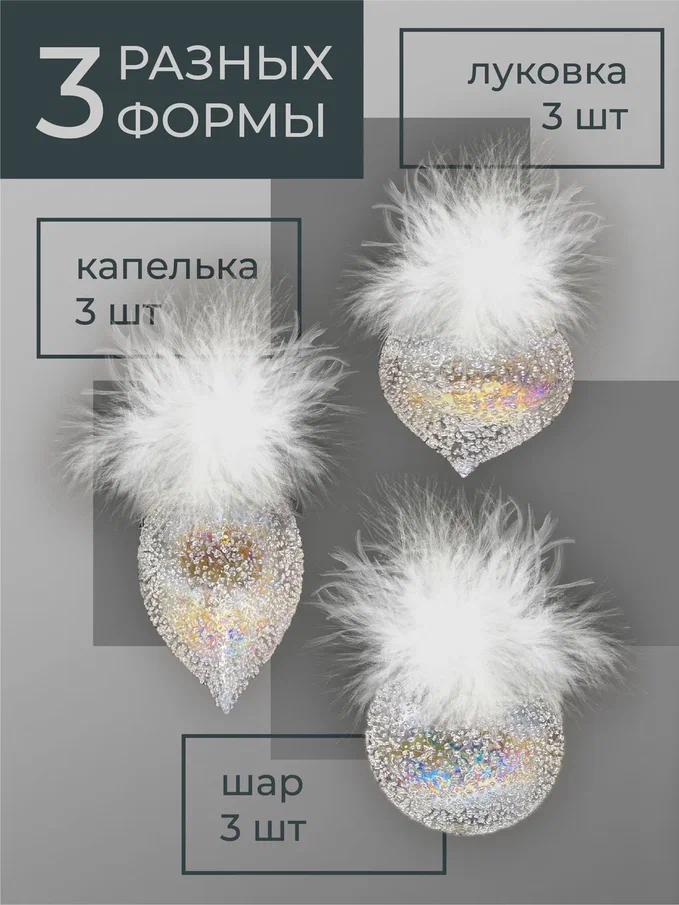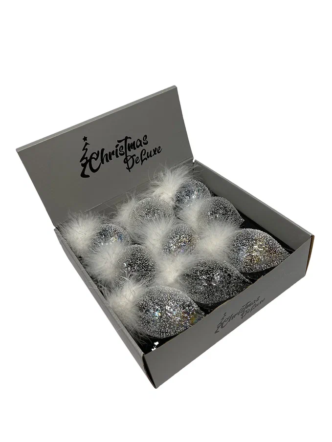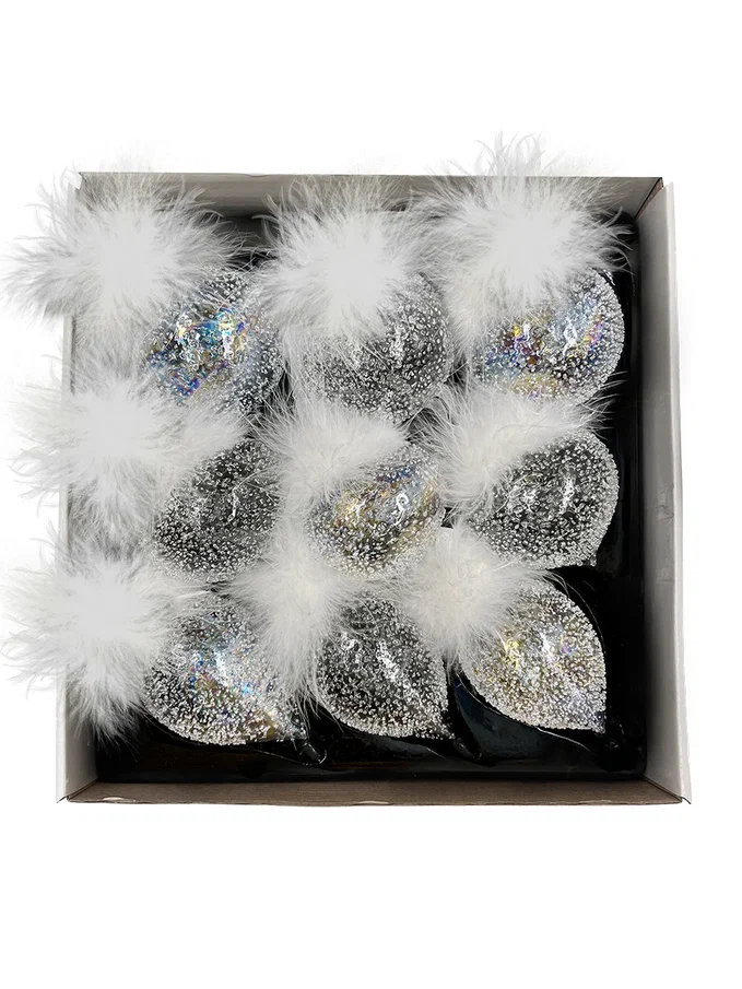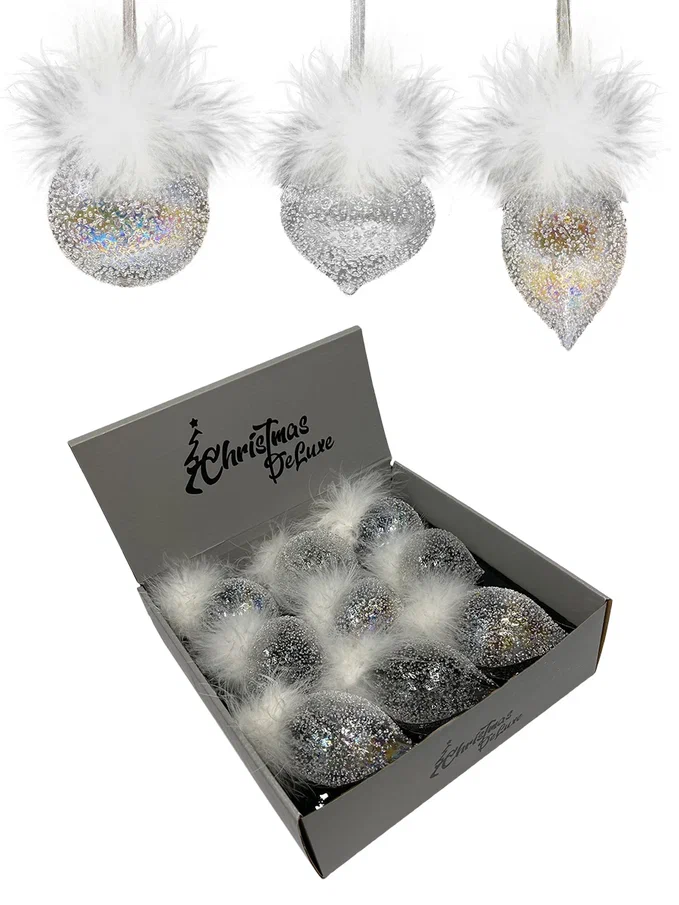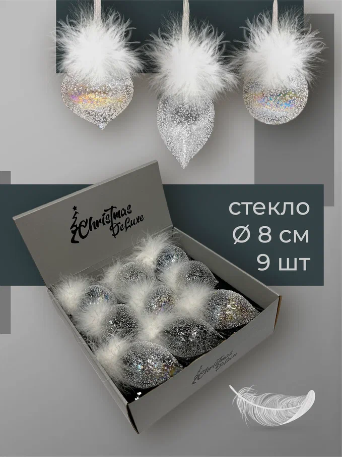 Набор стеклянных украшений Ледяной дождь от Christmas DeLuxe включает 9 штук. Украшения выполнены в трех формах: шар, капля и луковка. Они имеют прозрачный блестящий дизайн с натуральными перьями, что придает им элегантный и праздничный вид. Размер каждого украшения — 8 см.
