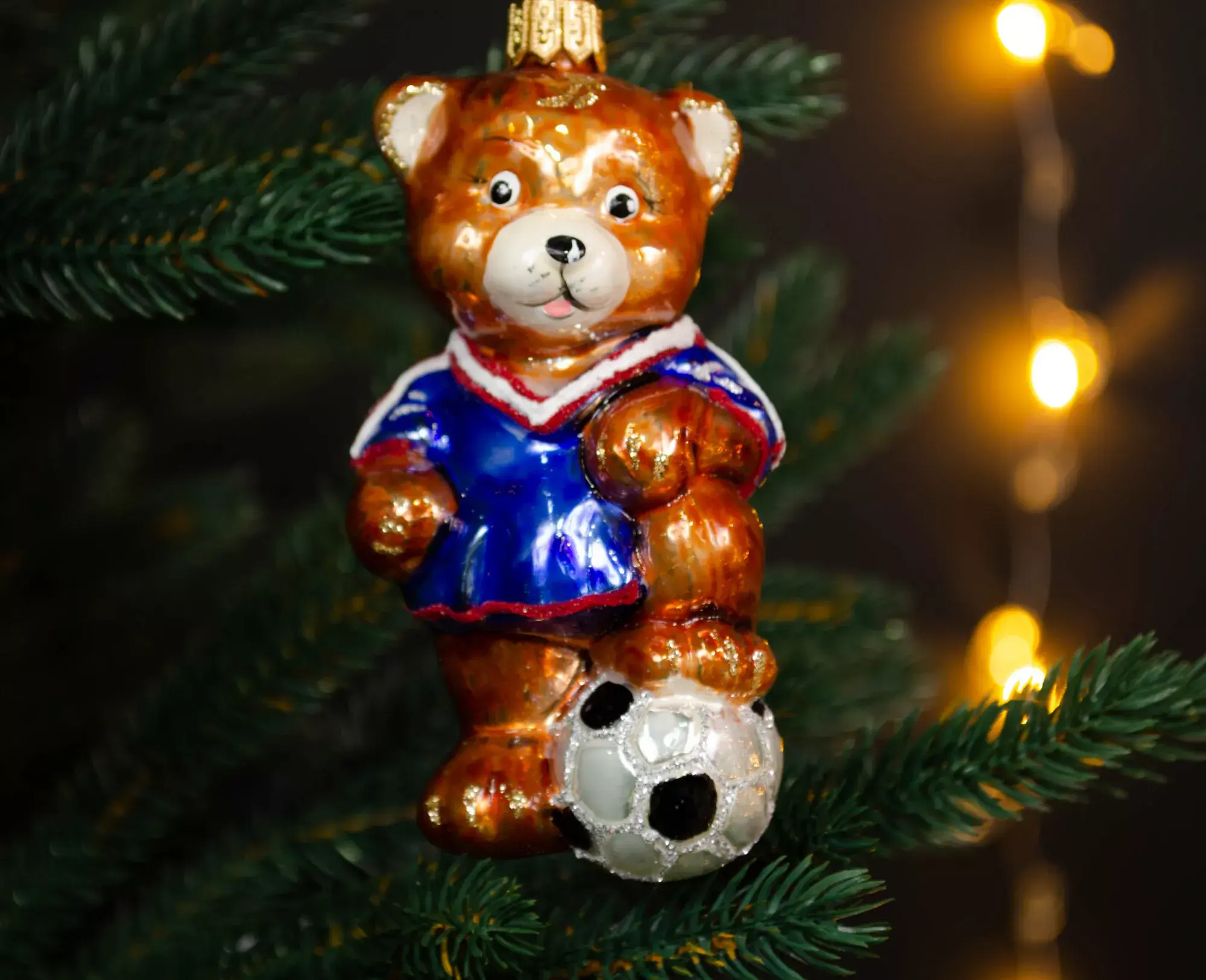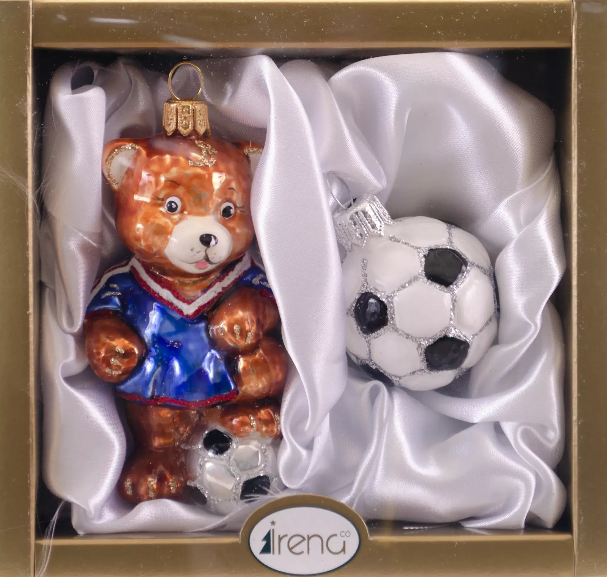 Собираетесь на зимние праздники в гости к родственнику или другу, который любит футбол? Настоятельно рекомендуем вам преподнести ему набор «Медвежонок футболист» от бренда Irena! Поверьте, он это оценит. В наборе два предмета: забавный медвежонок золотисто-коричневого цвета в ярко-синей футболке, с мячиком, а также отдельно – футбольный мяч. Украшение гармонично смотрится на любой елке.