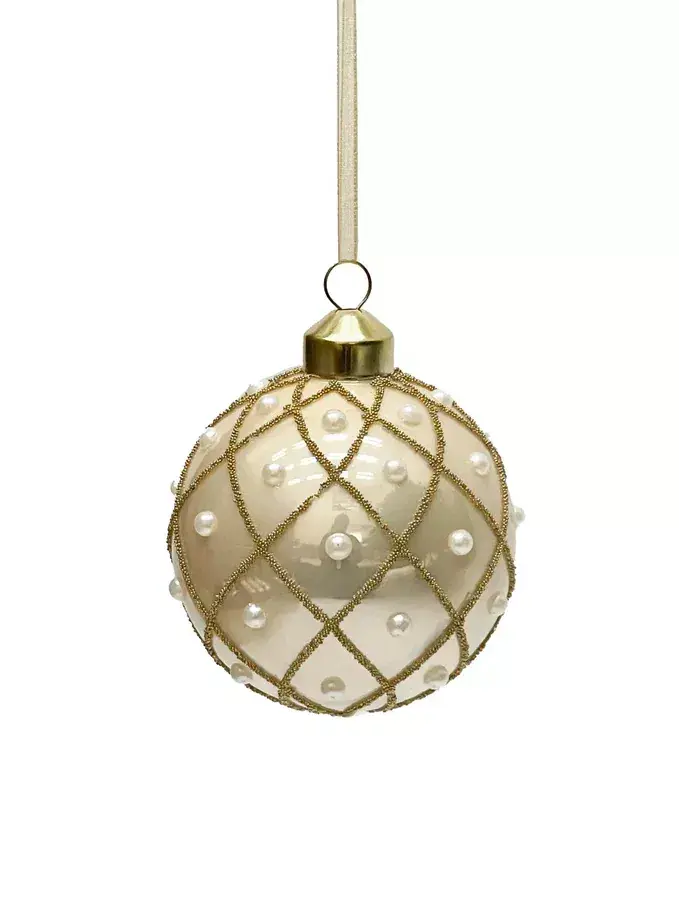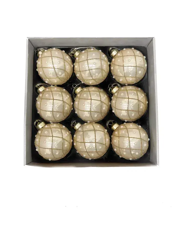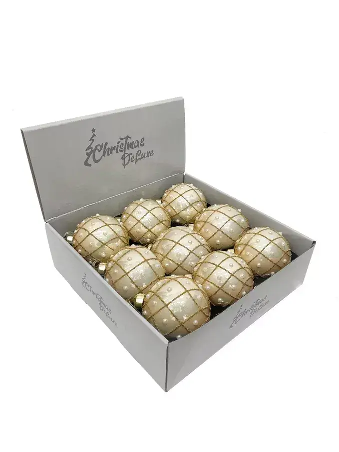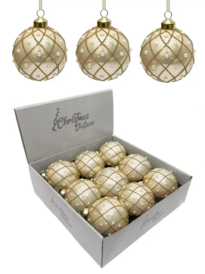 Набор винтажных стеклянных шаров Благородная нежность от Christmas DeLuxe — это изысканное украшение для праздничного интерьера. Шары выполнены из стекла, имеют бежевый цвет с золотыми элементами и декорированы бусинами, что придаёт им винтажный шарм. Диаметр каждого шара составляет 80 мм, а в наборе их 9 штук.