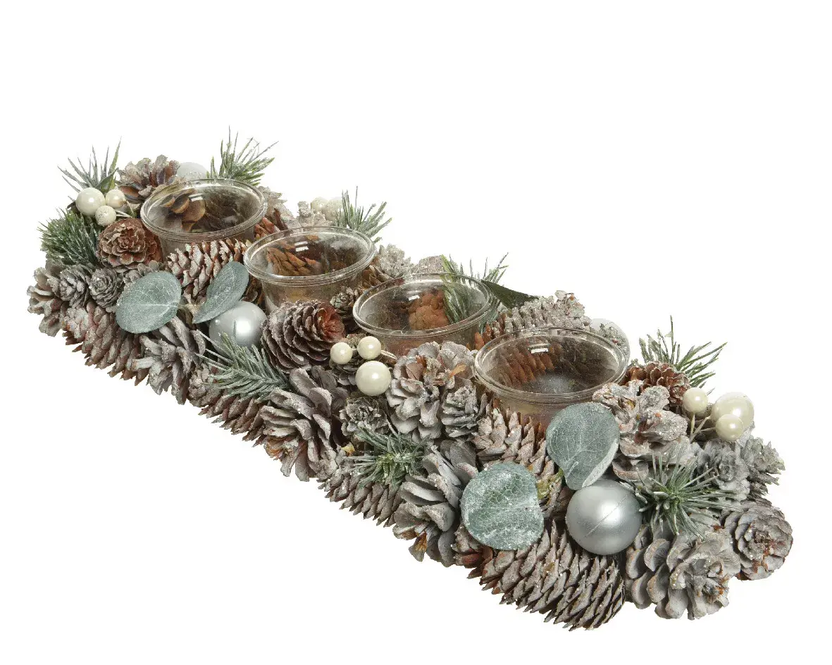 Оригинальный подсвечник «Оливия» от популярного бренда Kaemingk шикарно украсит новогодний стол, не говоря уже о праздничном романтическом ужине для двоих под бой курантов. Подсвечник представляет собой композицию из сосновых веток, шишек, покрытых белым глиттером, имитации жемчуга и ватных шариков. Представлен этот оригинальный элемент декора в двух вариациях: с обилием белого цвета и розовыми жемчужинами, а также выполненный в более темной цветовой гамме, с жемчужинами белого цвета. В подсвечник можно вставить 3 свечи на ваш вкус. Оба варианта смотрятся роскошно, а в свете свечей они напоминают декорацию к волшебной рождественской сказке! Хотите такой праздник в своем доме? Тогда непременно приобретите симпатичный подсвечник «Оливия».