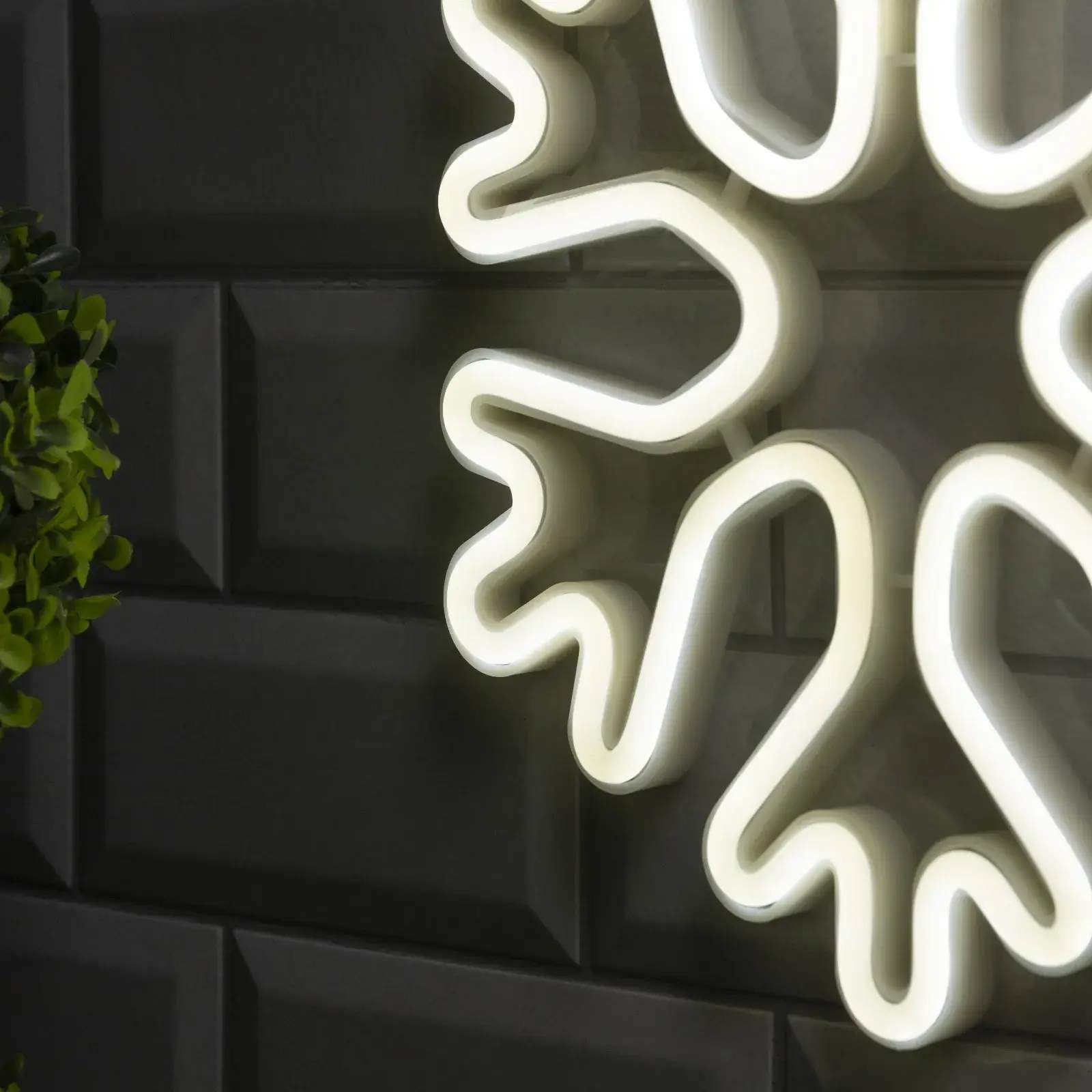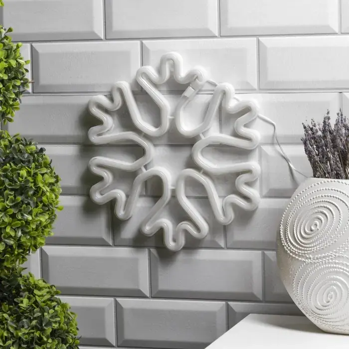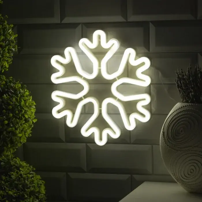 Соскучились по зиме и снегу? Тогда вы оцените по достоинству неоновую вывеску «Снежинка» из металла и пластика премиум-класса торжественного, ослепительно-белого цвета. Глядя на объемную снежинку, вы обязательно вспомните о том, что впереди веселые, беззаботные новогодние праздники и зимние забавы. Для работы светодиодной вывески требуются батарейки АА х 3.