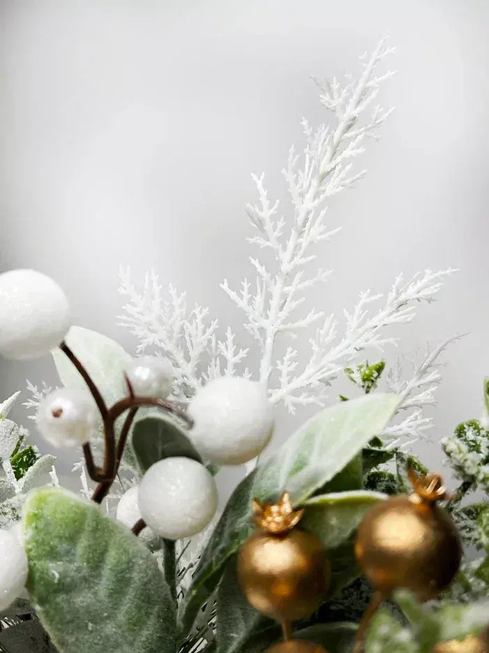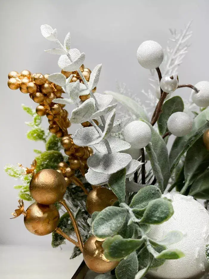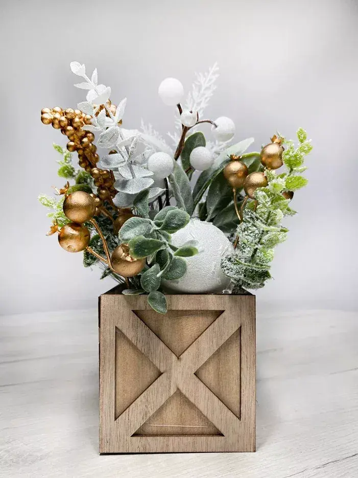 Если вы поклонник эко-стиля, то мы спешим порадовать вас оригинальной идеей – настольной композицией из элегантных белых цветов и роскошных золотых ягод. Ее фишка в том, что за основу взята деревянная коробка. Она-то и создает стиль и делает ансамбль неповторимым.