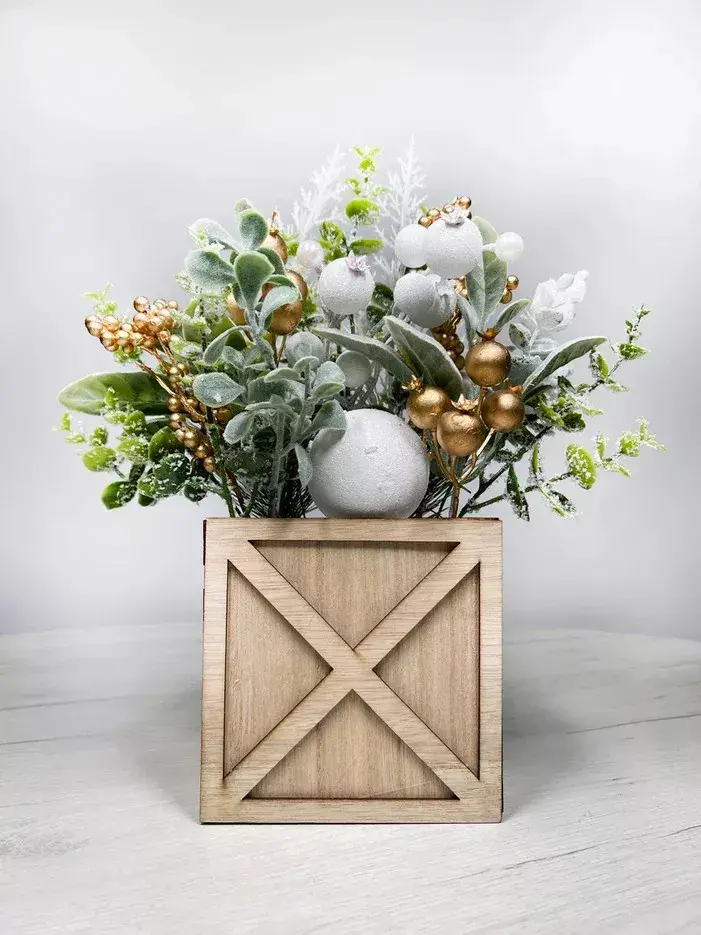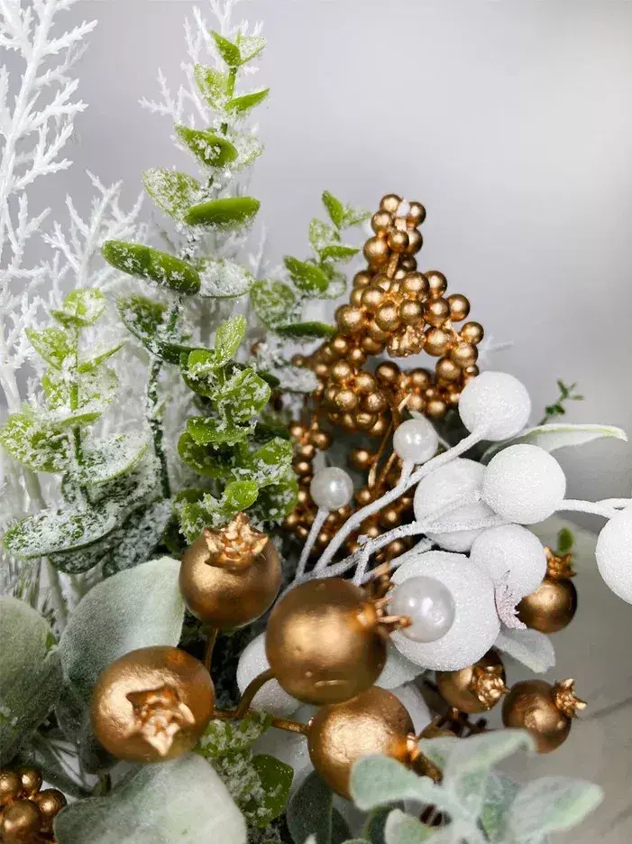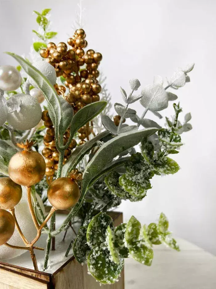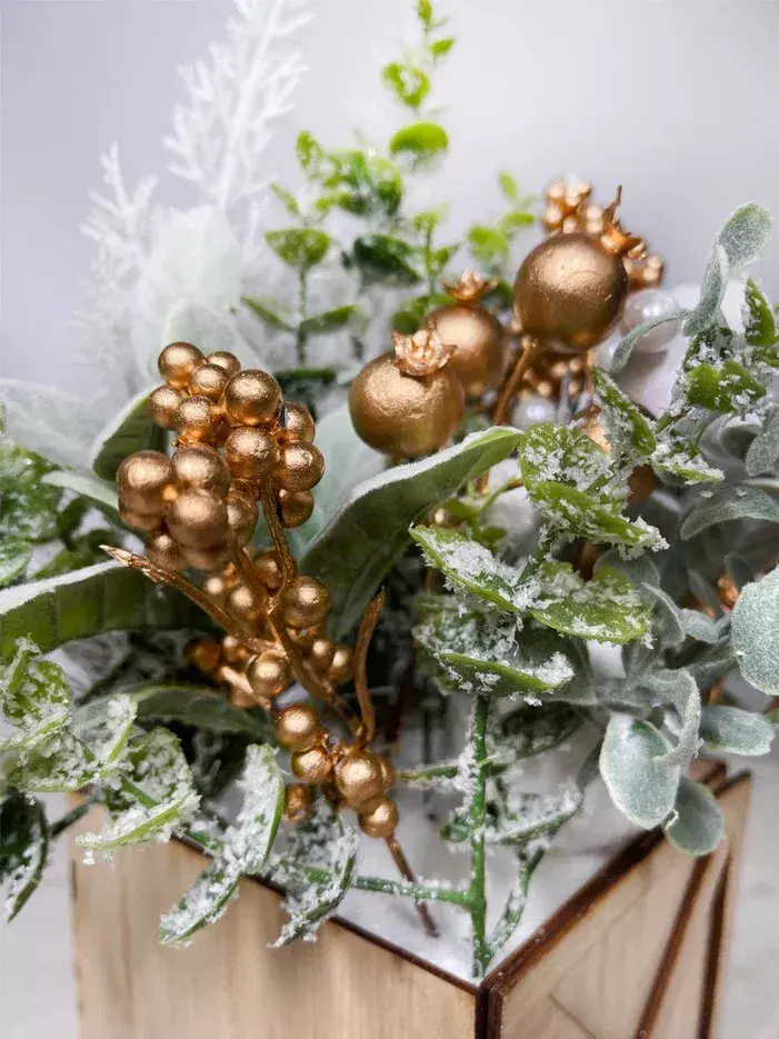 Настольная композиция в деревянной коробке, выполненная в праздничных бело-золотых тонах – великолепная альтернатива букету. Свежие оттенки зеленого напоминают о лете, совершенная белизна цветов рождает лирические мысли, а шикарные золотые ягоды придают композиции торжественности.