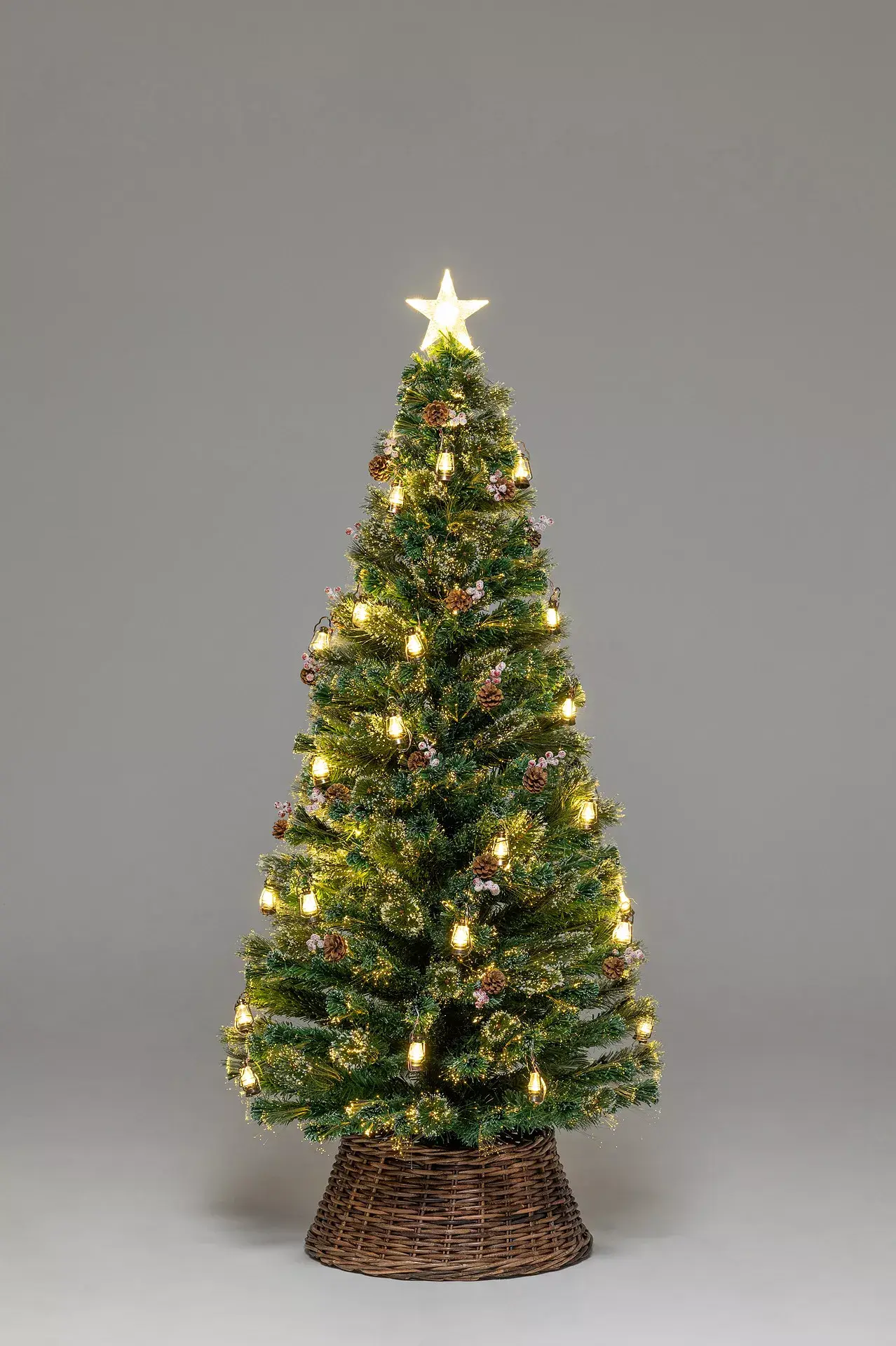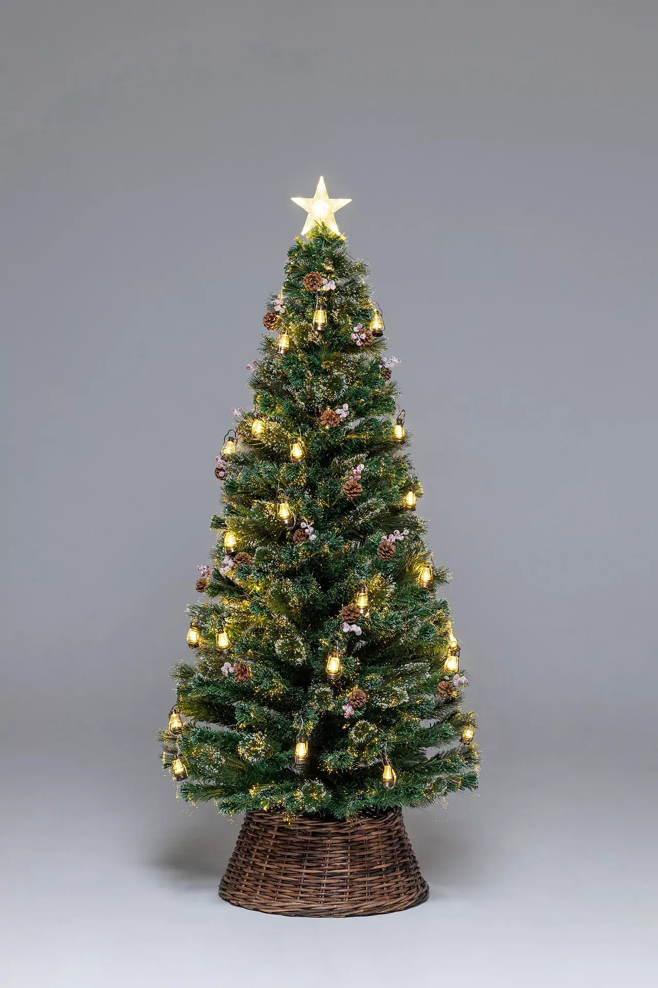 Чудо-елка Рождественские огни 150 см., увенчанная сияющей золотой звездой, пожаловала к вам из сказочного леса. Она так и манит своей густой кроной, украшенной лампочками в стиле ретро с завораживающими теплыми огоньками. Пышные веточки формируют стройный силуэт, выглядит благородно. Эффектный новогодний наряд главной героини праздника дополнен припорошенными инеем шишками и гроздьями алых зимних ягод. Ну, а ее естественный внешний вид – весомый плюс к торжественному образу. В комплекте контроллер для переключения 8 режимов свечения.