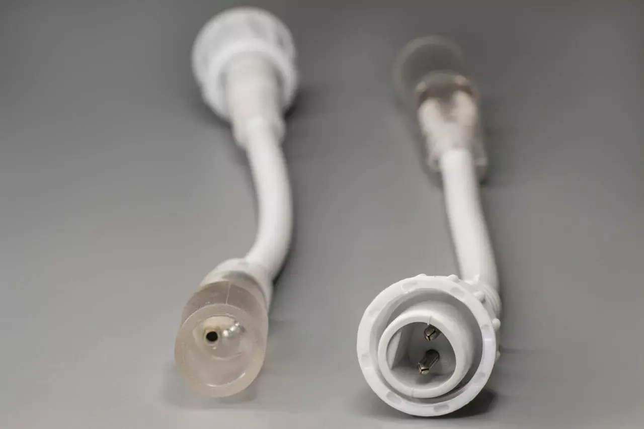 Переходник нить-дюралайт предназначен для последовательного включения в схему нити и дюралайта. Подходит для нитей с разъемом 2-pin, и 2-х проводного дюралайта диаметром 13 мм.