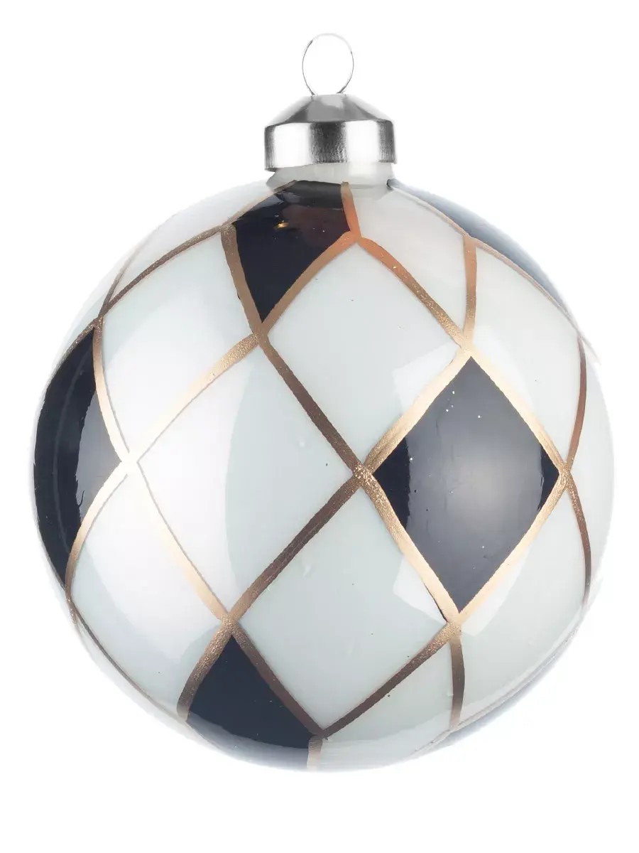 Если вы любитель лаконичных и элегантных цветовых решений, то обязательно оцените по достоинству стеклянный шар «Домино». Изделие выполнено в черно-белой цветовой гамме. Белые и черные ромбы в обрамлении тонких золотых линий смотрятся изысканно. Рекомендуем украсить шариком «Домино» елку яркого нестандартного цвета – красного, фиолетового, розового и т. д. Восторг гостей гарантирован!