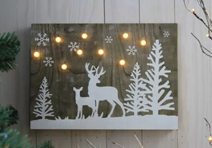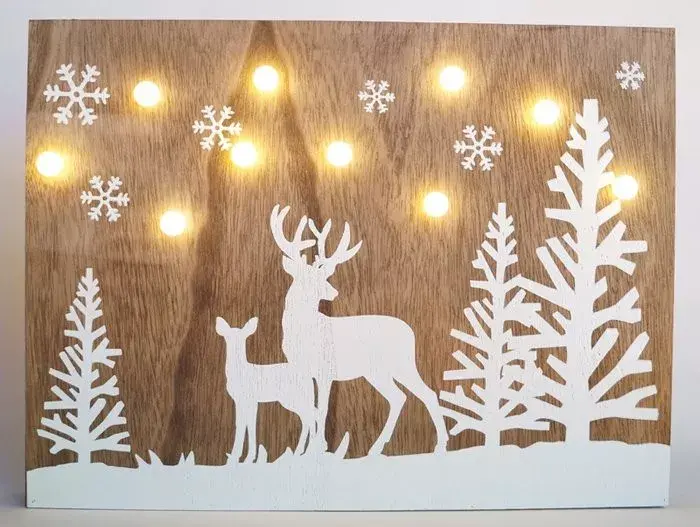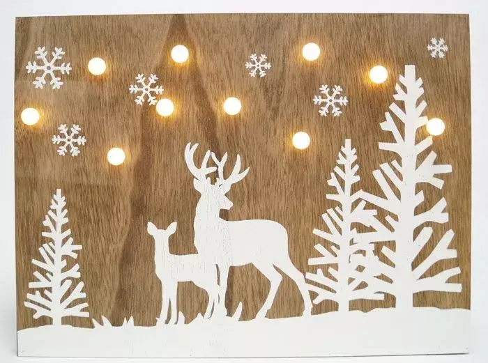Декорация с рисунком в виде оленей в зимнем лесу. С возможностью подвешивания. Работает на батарейках, теплое белое свечение.