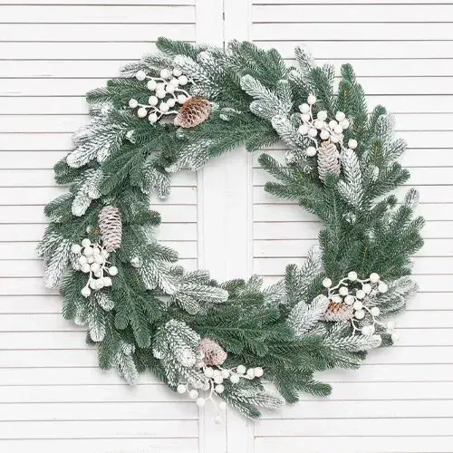 Переплетение зеленых и заснеженных ветвей с вкраплением шишек и мелких цветочков белого цвета выглядит оригинально и торжественно. Венок «Амелия» наверняка высоко оценят ценители красоты и смелых идей. Он никого не оставит равнодушным. Роскошное праздничное украшение, выполненное в холодной цветовой гамме, придаст шика и благородства даже самому скромному жилью. И, несмотря на сдержанные, приглушенные оттенки, улучшит настроение всех присутствующих на празднике.