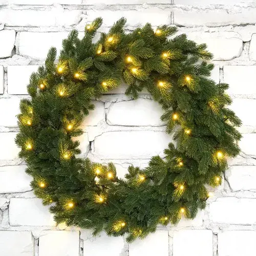 Рождественский венок Чарующий из 100% литой хвои дополненный встроенной Led гирляндой с теплым-белым свечением создаст настоящий сказочный уют в вашем интерьере и подчеркнет его индивидуальность. Все веточки выполнены из литой хвои, каждая из них отливается в специальной форме - это самые реалистичные изделия. Гирлянда работает от сети, каждая лампочка словно маленький светлячок освещает волшебным теплым свечением ваше жилище.