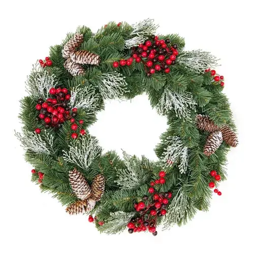 Роскошный хвойный венок "Элитный" в красном исполнении станет тем самым элементом интерьера, который создает особую праздничную ауру. Густая зеленая хвоя с серебристыми шишками, сочными красными ягодами и серебристыми искрящимися веточками смотрится шикарно и преобразит интерьер.