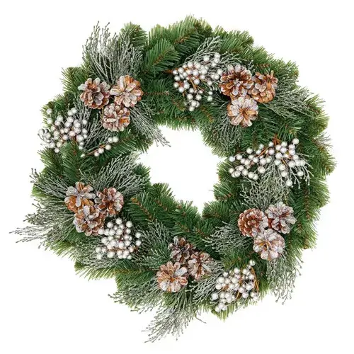 Роскошный хвойный венок "Элитный" в серебряном исполнении станет тем самым элементом интерьера, который создает особую праздничную ауру. Густая зеленая хвоя с серебряными шишками, ягодами и веточками смотрится шикарно и преобразит интерьер.