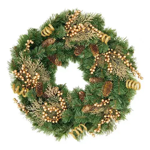 Роскошный хвойный венок "Элитный" в золотом исполнении станет тем самым элементом интерьера, который создает особую праздничную ауру. Густая зеленая хвоя с золотыми шишками, ягодами и веточками смотрится шикарно и преобразит интерьер.,