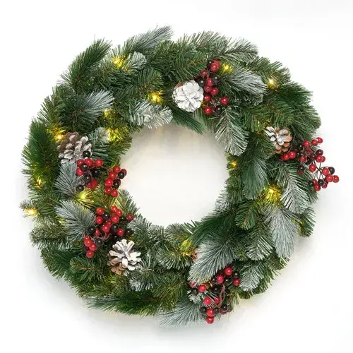 Превосходный и пушистый рождественский венок Очарование со встроенными Led лампочками теплого-белого свечения создаст настоящий сказочный уют в вашем интерьере и подчеркнет его индивидуальность. Венок выполнен из нескольких видов материала - лески и мягкой хвои pvc, он весь украшен настоящим новогодним декором в виде натуральных шишек и красных ягодок рябины. «Фишка» этого украшения – гирлянда из 30 теплых LED-ламп, работающая на батарейках.