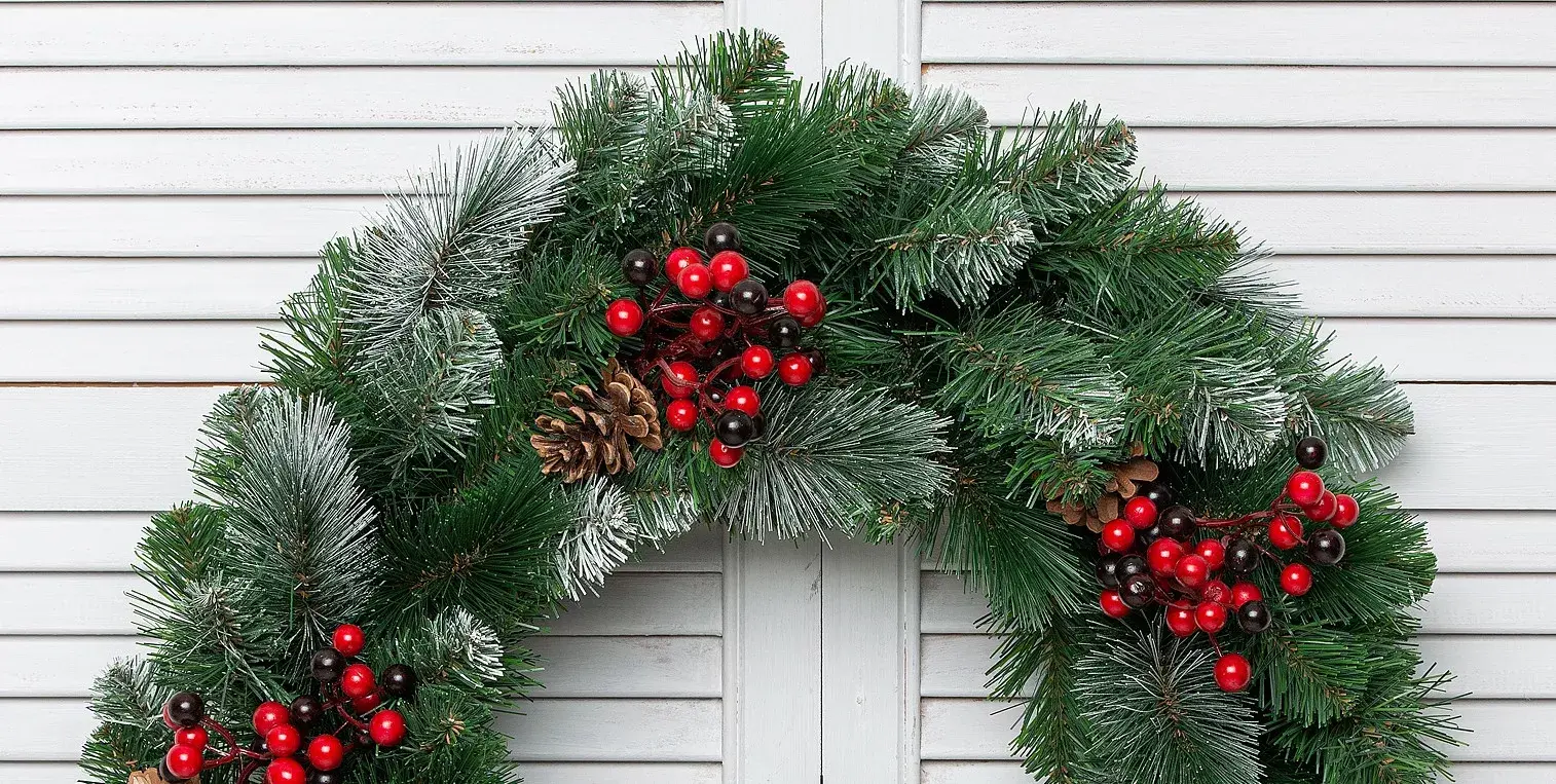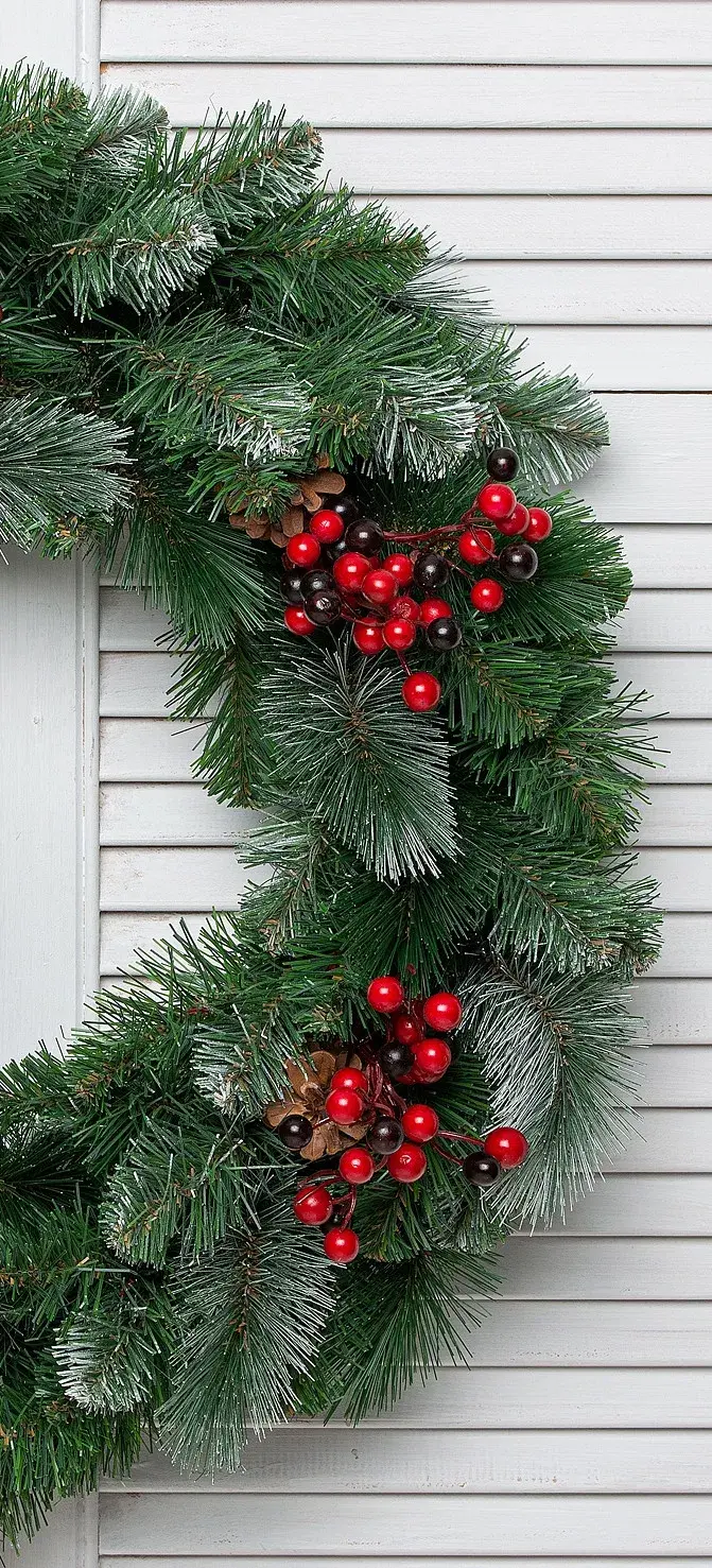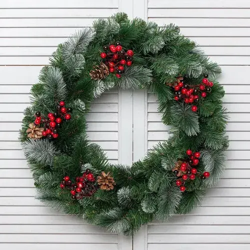 Хвойные веточки, слегка покрыты инеем рождественских морозов, они богато украшены натуральными шишками и декоративными ягодками. Изделие смотрится по-настоящему шикарно, оно передаст в Ваш дом натуральные природные краски и подарит незабываемое сказочное настроение.