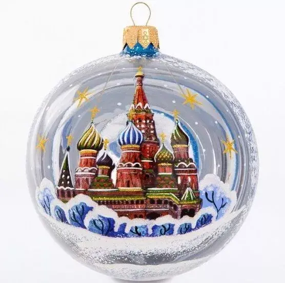 Грандиозная идея от наших мастеров – прозрачный, словно ледяной, стеклянный елочный шар с 3D-изображением легендарного храма Василия блаженного. Яркий, реалистичный рисунок на прозрачном фоне смотрится очень выигрышно. А заснеженные кустарники в холодных тонах и звездочки жизнерадостного желтого цвета придают композиции особый шарм и завершенный вид.
