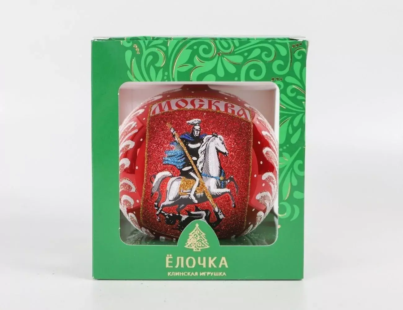 Тот, кто горячо любит Златоглавую, будет счастлив получить в подарок елочный шар «Москва» с изображением бесстрашного всадника на белом лихом скакуне. Рисунок алого цвета на синем фоне в обрамлении ажурного белоснежного орнамента смотрится смело и даже дерзко, но при этом невероятно эффектно. Стеклянный елочный шар «Москва» – для настоящих патриотов!