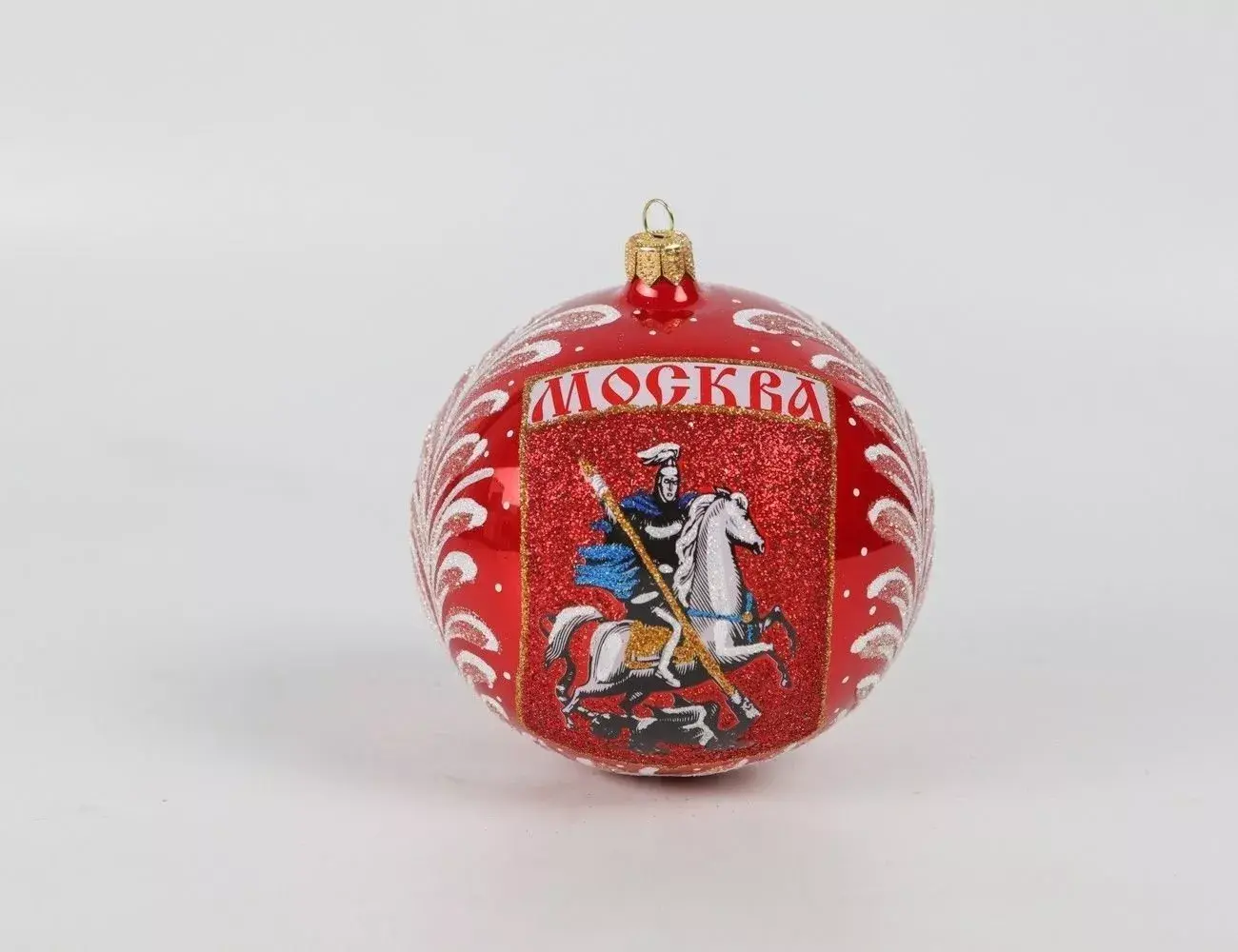 Тот, кто горячо любит Златоглавую, будет счастлив получить в подарок елочный шар «Москва» с изображением бесстрашного всадника на белом лихом скакуне. Рисунок алого цвета на синем фоне в обрамлении ажурного белоснежного орнамента смотрится смело и даже дерзко, но при этом невероятно эффектно. Стеклянный елочный шар «Москва» – для настоящих патриотов!