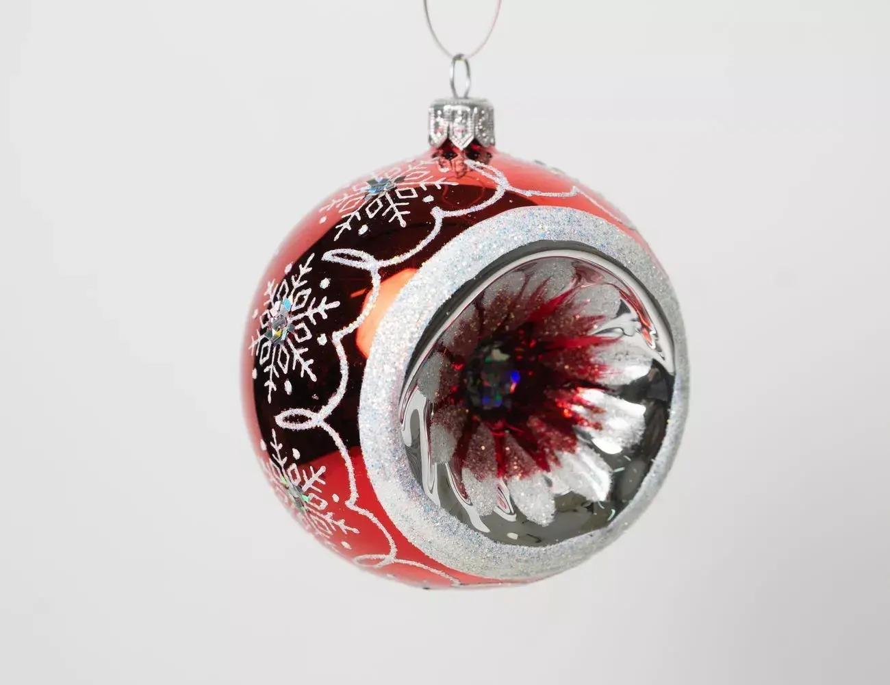 Ёлочный шарик «Прелесть» обращает на себя внимание изысканным дизайном. Резные снежинки причудливой формы удивительно прекрасны на ярком аметистовом фоне. В композиции сочетаются, казалось бы, совершенно не сочетаемые вещи. Нежный цветок в обрамлении снежинок – смелое решение, не правда ли? Может, это зима встретилась с летом? Ведь в новогоднюю ночь и не такое бывает!
