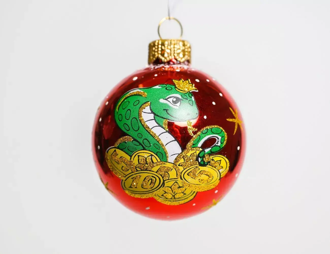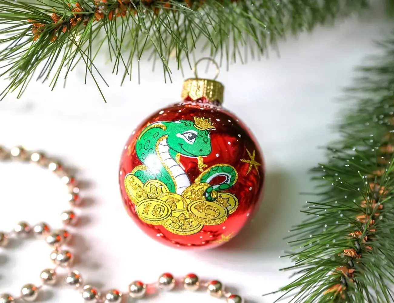 А вот и главная героиня грядущего года, изображенная на елочном шаре «Зодиак». Эта мудрая леди смотрит лукавым взглядом, словно хочет сказать: «Вы даже не представляете, какие сюрпризы я для вас приготовила!» Красавица змея очень выигрышно смотрится на красном фоне. А золотые звездочки и легкий снегопад завершают композицию, делая ее по-настоящему интересной.