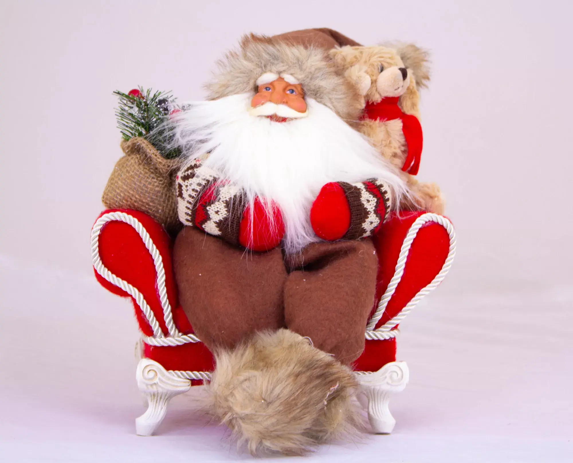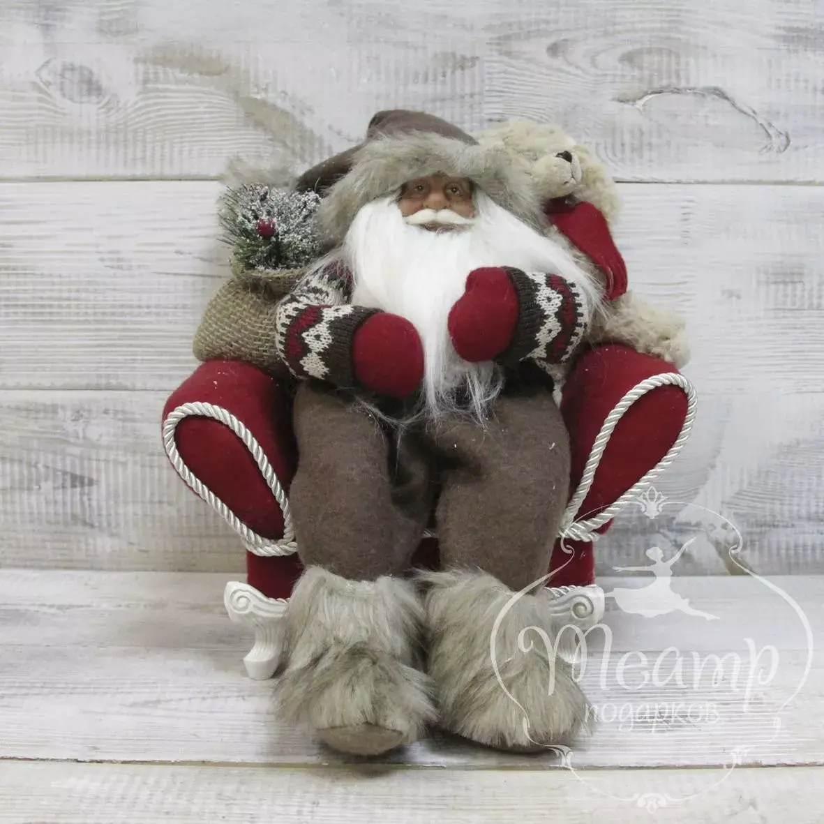 Хотите порадовать своих домашних необычным новогодним персонажем? Тогда именно этот забавный Санта-Клаус со своим другом песиком порадует Вас. Они мило расположились в шикарном кресле с белым теснением на деревянных ножках. Выполнена композиция и высококачественного текстиля приятного на ощупь. Высота данной модели 26 см. Вы однозначно найдете самое достойное место в своем доме для этого доброго Санты!