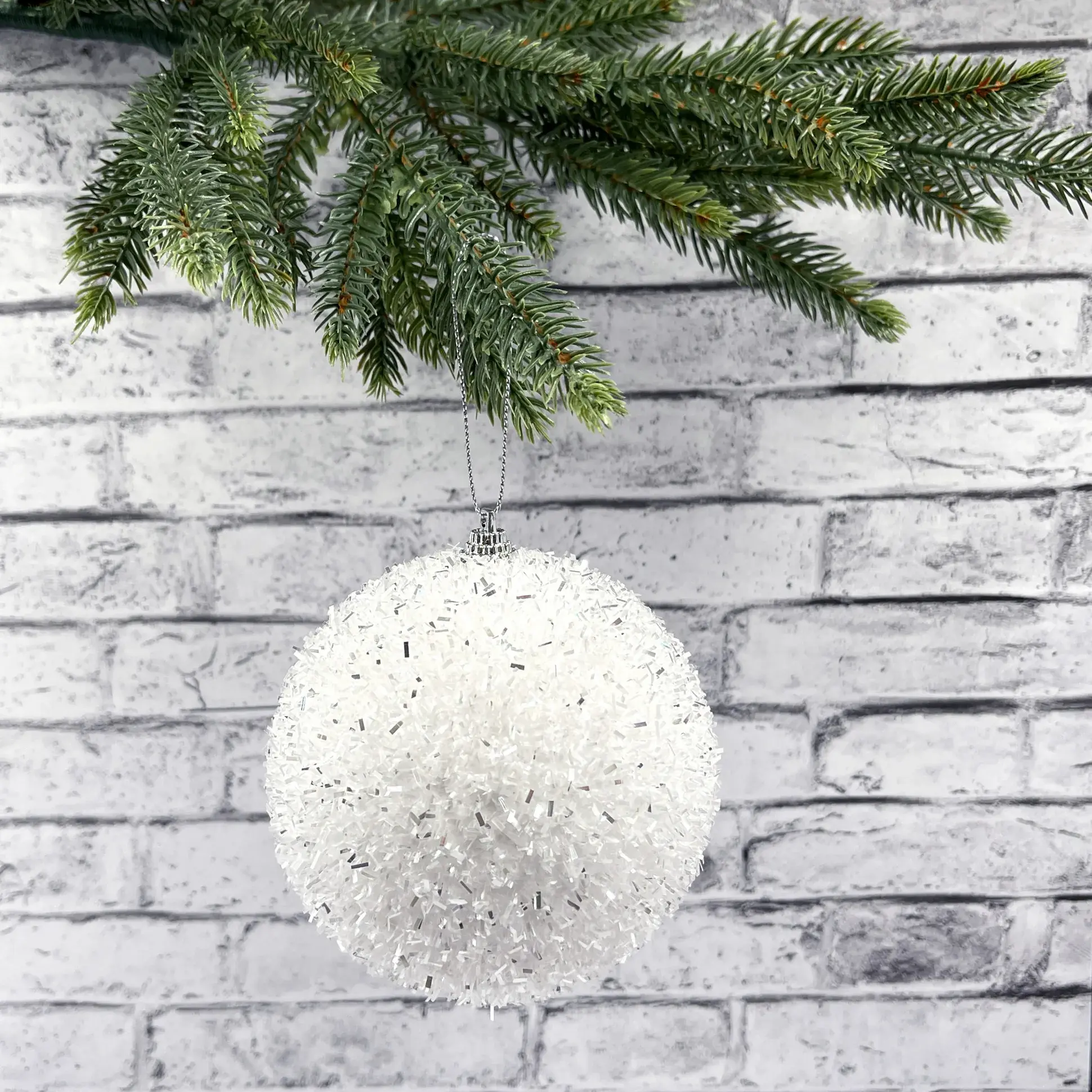 Новогодние шары «Бисер» белого цвета, словно припорошенные свежим декабрьским снежком, чудо, как хороши. Они – само совершенство! Такие шары используют для украшения помещений и высотных ёлок. Изделие выглядит невероятно привлекательно, но на этом его достоинства не заканчиваются. Шары изготовлены из пенопласта, а значит, не разобьются и прослужат вам не один год.
