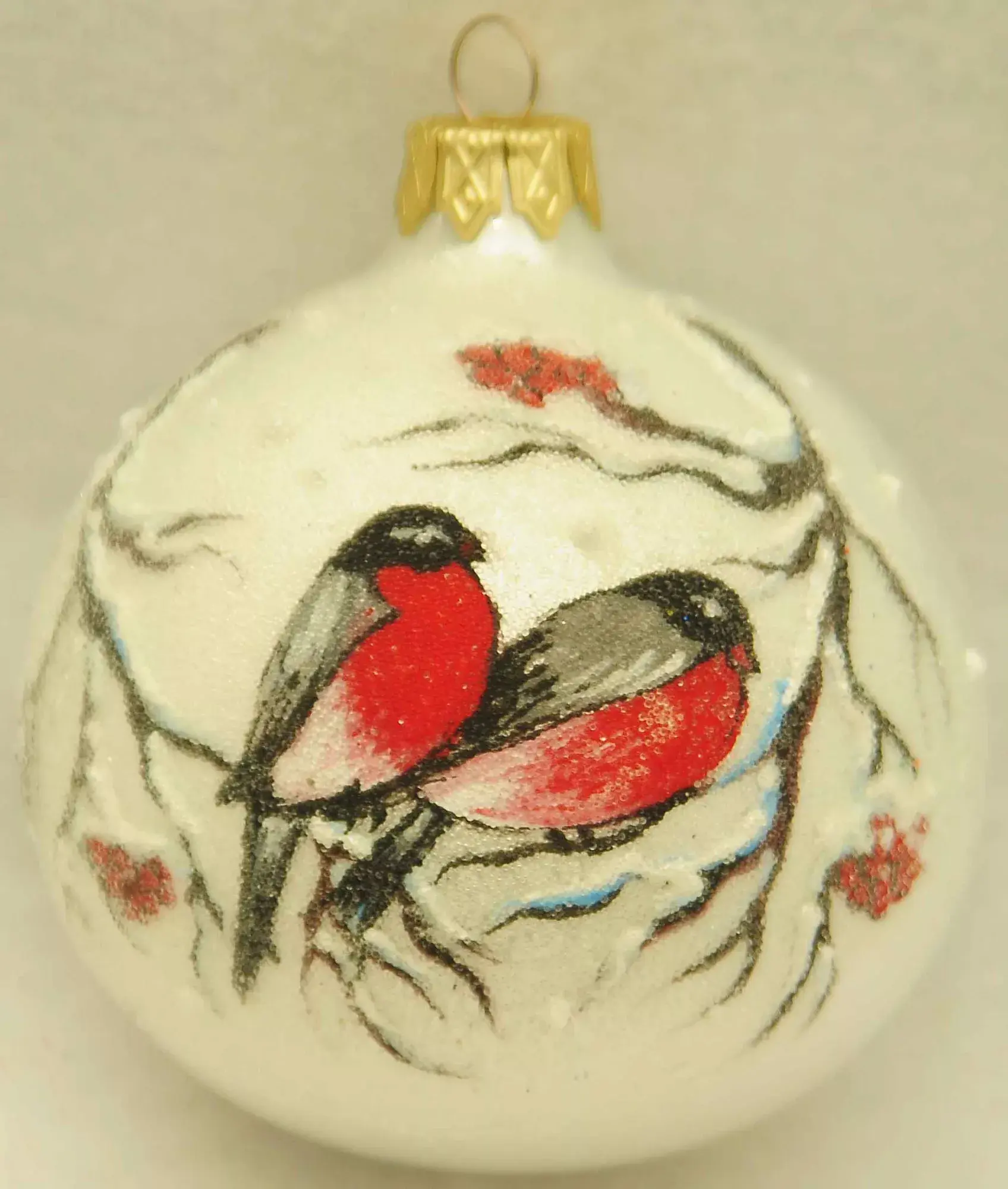 Яркие акценты снежного пейзажа: гроздья рябины и красногрудые снегири на шаре из тонкого стекла, не оставят без внимания Вашу ель. Украшение с ручной росписью придется по вкусу даже самым искушенным любителям стекла.