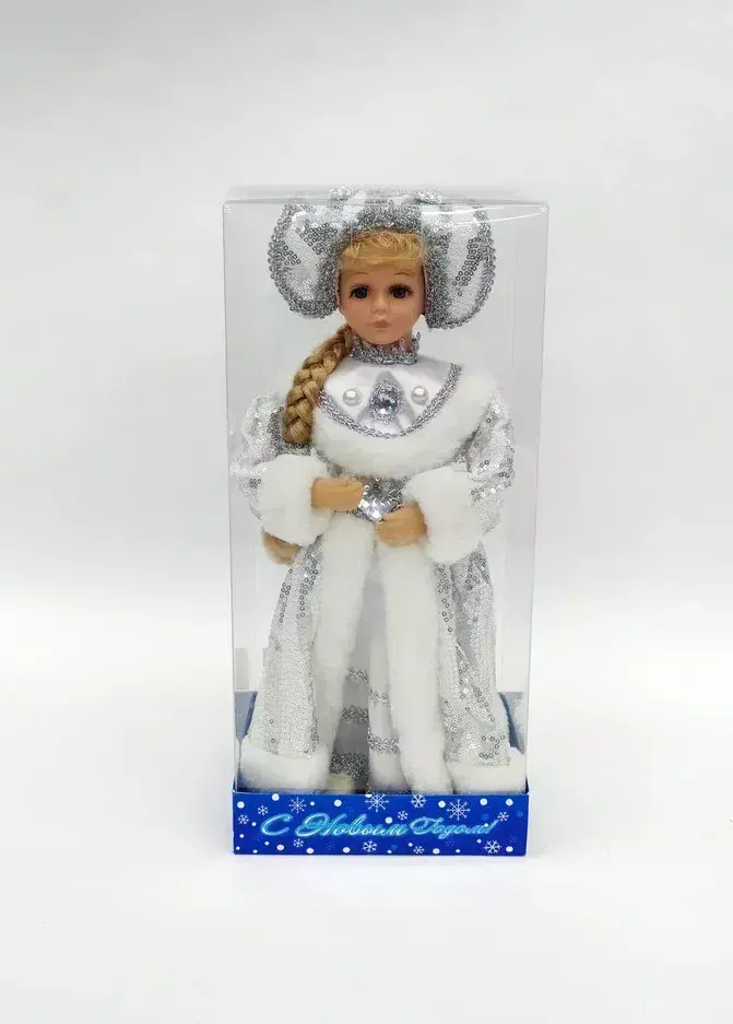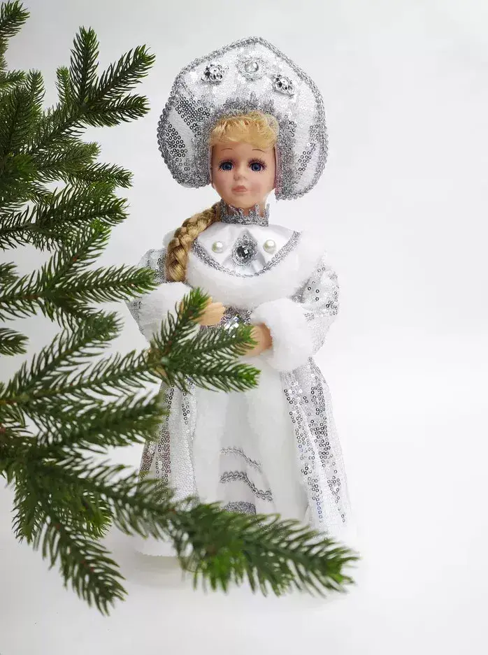 Снегурочка в серебристой шубке, отороченной белым пушистым мехом – настоящая русская красавица! Серебристо-белый кокошник красиво оттеняет пшеничные волосы, дивные синие глаза и свежесть прелестного юного личика. Игрушка придется по душе тем, кому интересны народные мотивы. Но даже если вы не любитель фольклора, «Снегурочка в белой с серебром шубе и кокошнике» не оставит вас равнодушным, ведь она так мила!
