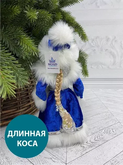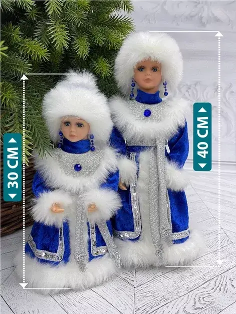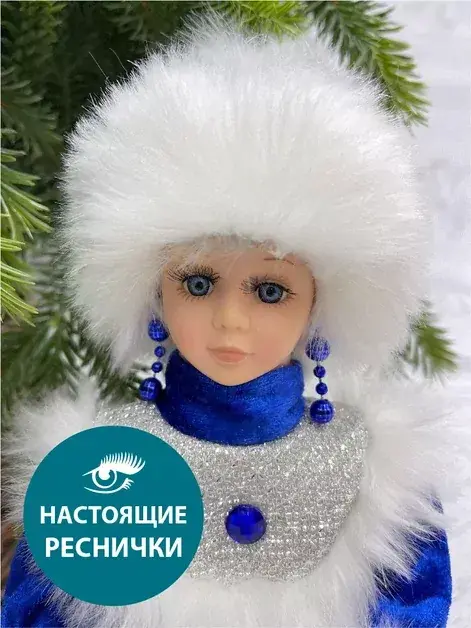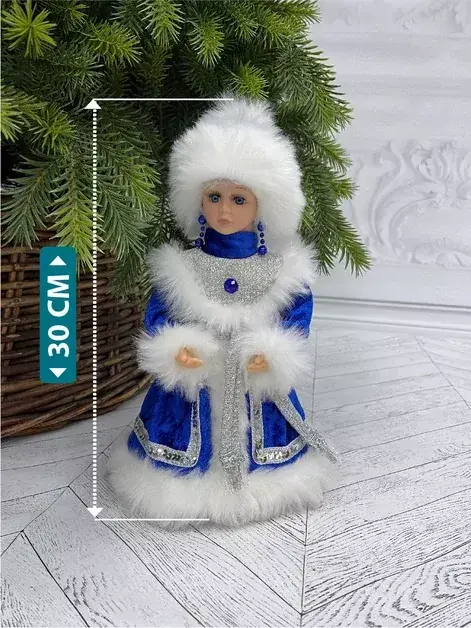 Юная русская красавица спешит к вам, чтобы поздравить с Новым годом! Ей очень идет шикарный зимний наряд. Насыщенный синий цвет шубки и шапочки оттеняет эти дивные голубые глаза, а пушистый мех эффектно обрамляет прелестное личико. Такая красавица станет желанной гостьей в каждом доме. В нашем каталоге есть кукла Снегурочка «Русская Краса» размером 30 и 40 см. (арт. 84667 и арт. 84668).
