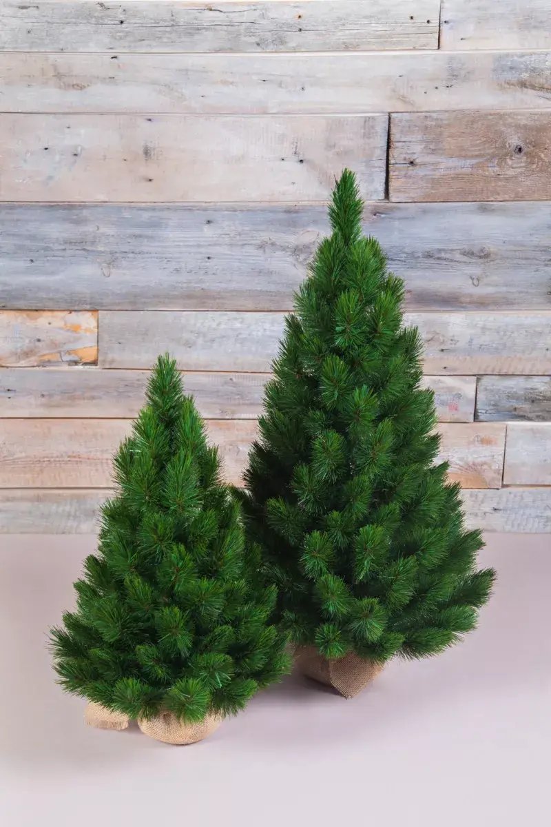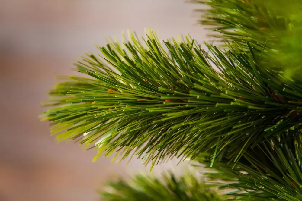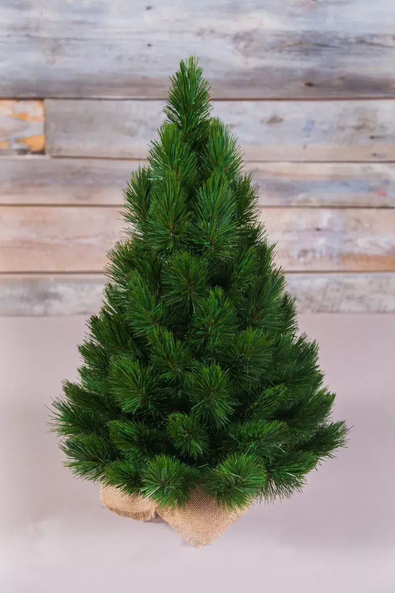 Вид хвои называется «жесткой», создана она из полимерной лески PVC. Леска - высококачественный материал, из которого получаются веточки, они не помнутся и не потеряют вид в течение десятка лет. Это один из многочисленных плюсов приобретения искусственной елки. Изделие устойчиво будет стоять на деревянной подставке, декорированной мешковиной, это придает ему оригинальный вид, будто подготовленная для посадки молодая живая елочка.
