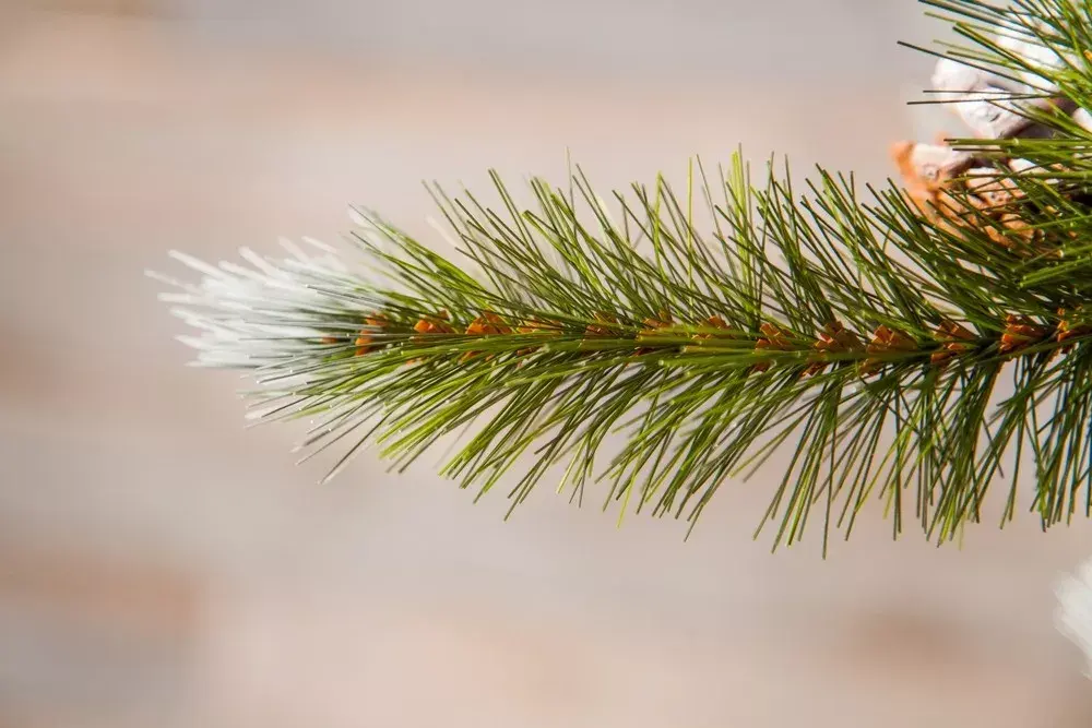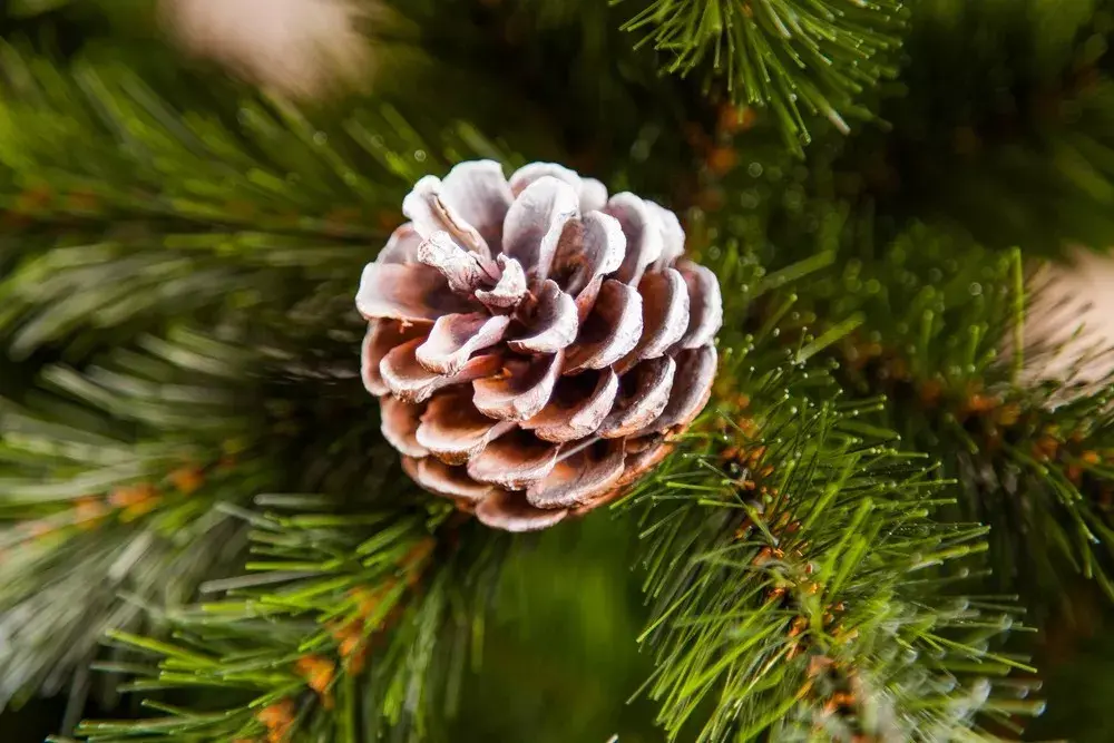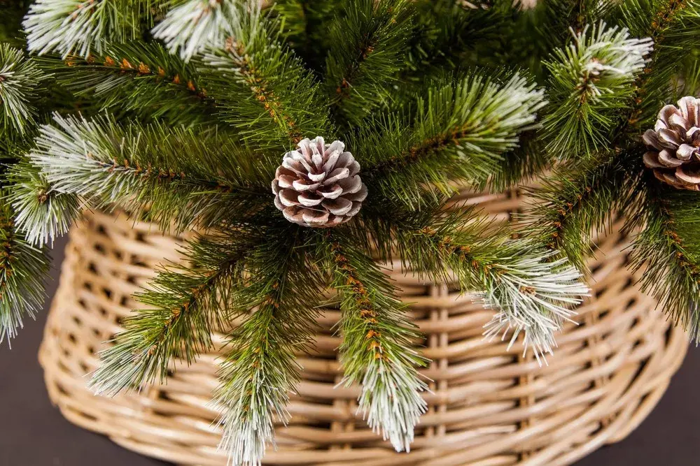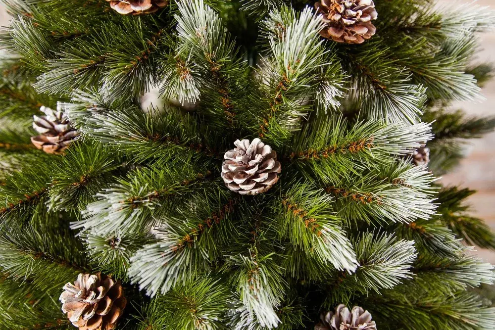 Приятное свойство придают прокрашенные белым цветом кончики ветвей. Благодаря этому елочка выглядит будто покрытая легким инеем в морозное утро. Представьте только как удивительно и необычно видеть это у себя дома, в тёплой уютной комнате. В качестве дополнительного декора на веточках расположены натуральные шишки. С ними Ваши гости не сразу смогут понимать, что ель искусственная, а не живая.