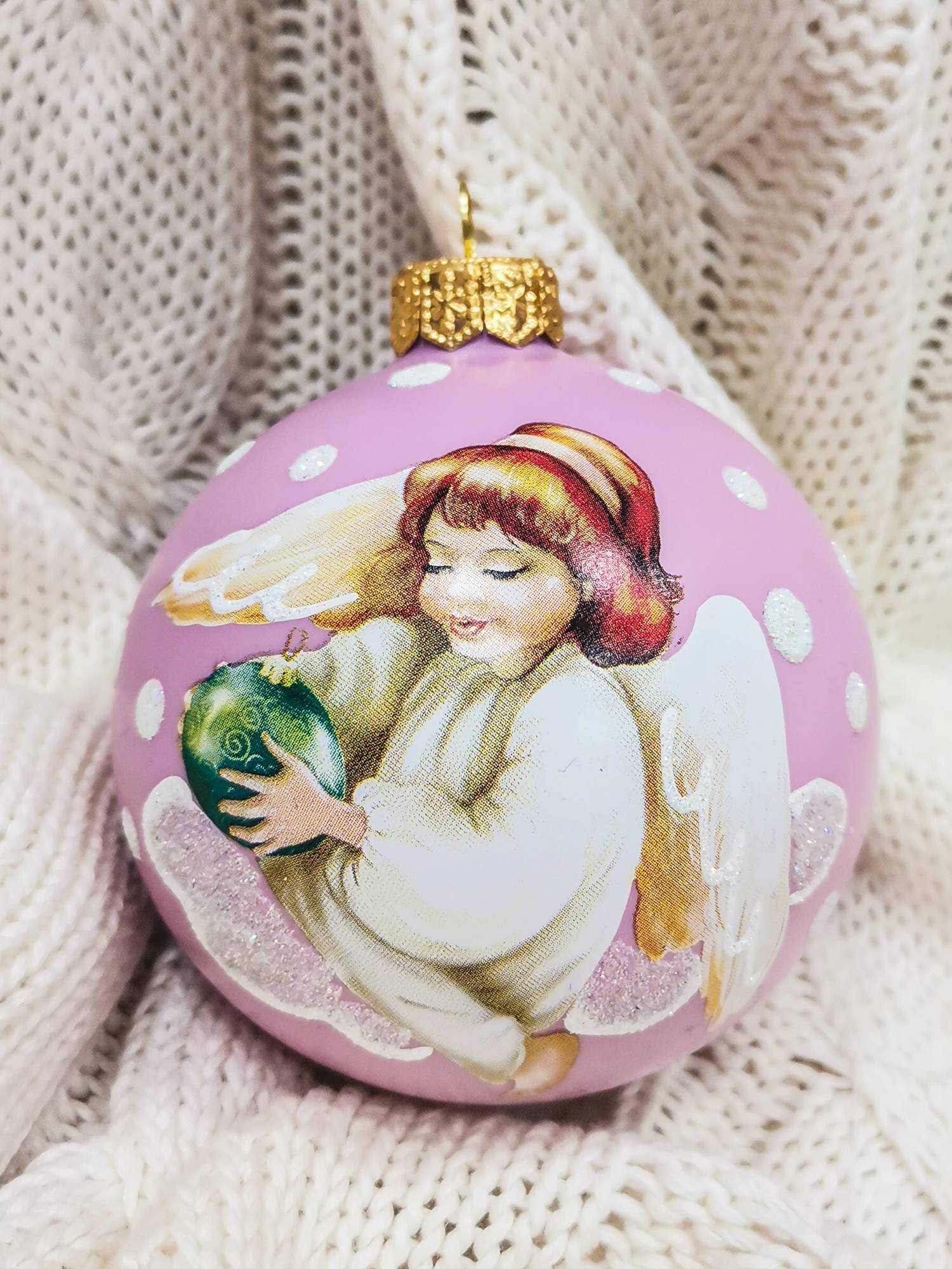 Изображение девочки-ангелочка на нежно-розовом фоне выглядит потрясающе красиво и невероятно трогательно. Елочная игрушка «Ангелочек с шариком» гармонично смотрится на фоне хвои белого, фиолетового, серебристого, золотистого и, конечно же, зеленого цвета. Пусть этот милый ангелочек хранит вас и тех, кто вам дорог не только в новогоднюю ночь, но и весь грядущий год!