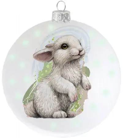 Очаровательный пушистый 3D-заяц на фоне прозрачного стекла смотрится невероятно эффектно. Реалистичный зверек покоряет с первого взгляда, а оформление снежинками придает шарику воздушность и подчеркивает новогоднюю атмосферу. Шар «Белый кролик» преобразит вашу елку, какого бы цвета она ни была, но особенно выигрышно он смотрится на фоне темной хвои.