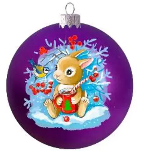 «Крольчонок с синичкой» – невероятно красивая и добрая композиция. Симпатяга крольчонок и желтогрудая пташка, сидящая на рябинке, притягивают взгляд и побуждают любоваться ими до бесконечности. А на фоне невероятно глубокого и роскошного фиолетового цвета эта трогательная картинка выглядит необычно. Игрушка достойно украсит елку серебристого, голубого или белого цвета.