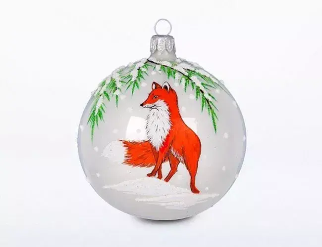 А вот и красавица-лиса, грациозно дефилирующая по зимнему лесу! Патрикеевна кокетливо распушила свой роскошный хвост и приготовилась к новогоднему селфи под елочкой, припорошенной ароматным снежком. Композиция на елочном шаре выполнена в ярких, праздничных цветах, на которые хочется смотреть и любоваться. А объемные элементы композиции делают ее выразительнее.