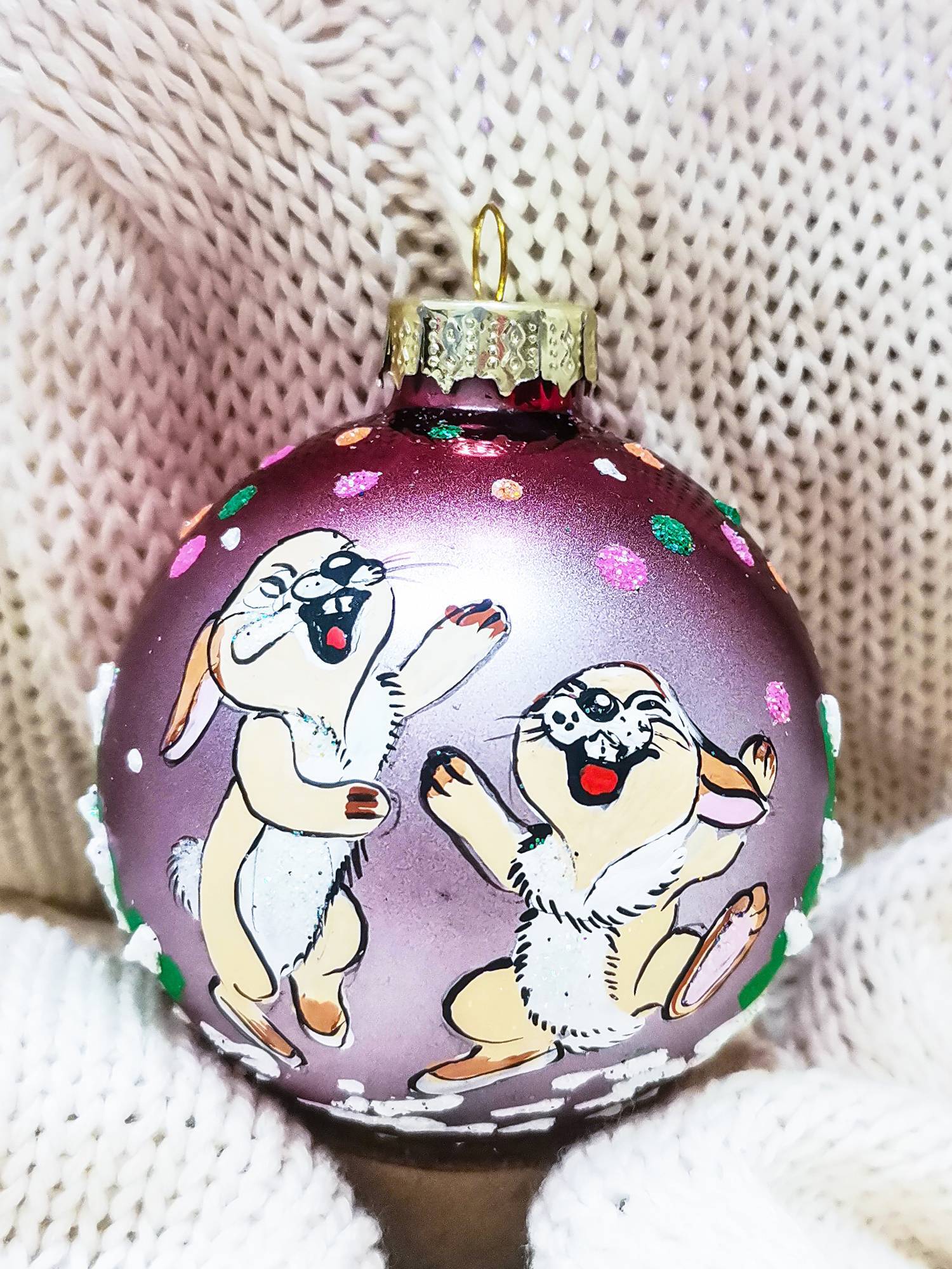 Елочный шар «Озорные крольчатки» привлекает внимание оригинальным фоном – глубоким лиловым с эффектом «деграде». А на этом необычном фоне изображены белоснежные крольчата. Беззаботные зверушки веселятся и дурачатся в ожидании Нового года. Они-то знают: как только часы пробьют двенадцать, все горести и печали останутся далеко-далеко позади, а год будет счастливым.